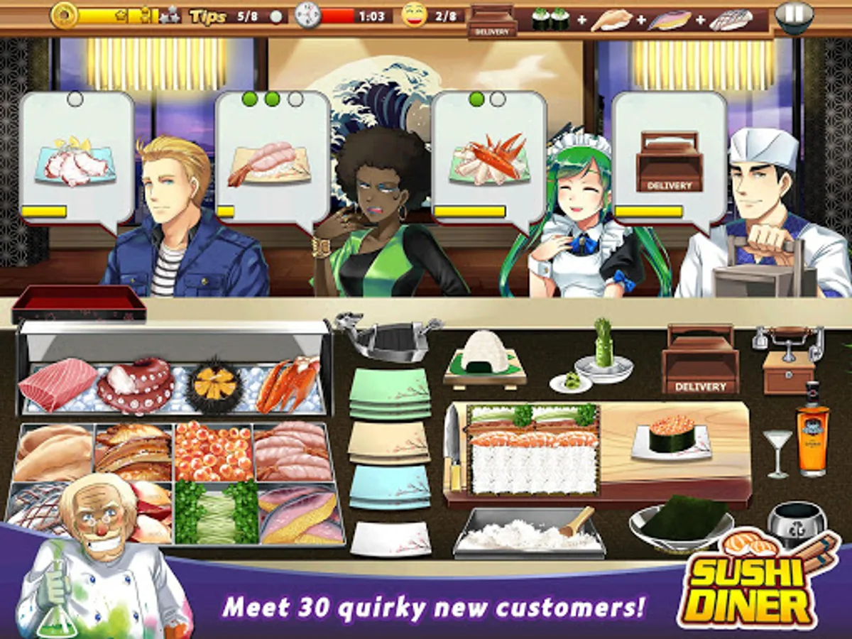Wanna get more successful and famous? Spend your profits on upgrades for food and appliances for your restaurant! Upgrade your sushi fish sources, sashimi knife, and more to ensure all customers get three-star service!