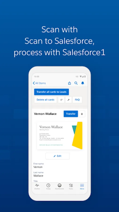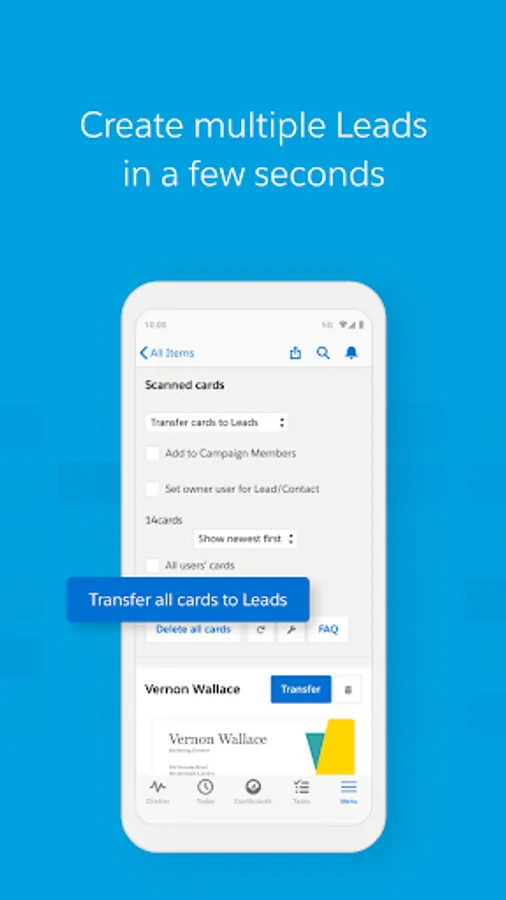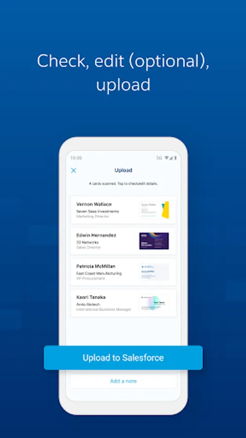 - Scan up to 4 cards at a time, and tap upload. It’s as simple as that. All the scanned contacts are instantly uploaded to a review page in Salesforce or Salesforce 1 app, where you can make any necessary additions or adjustments, and then allocate the leads accordingly.