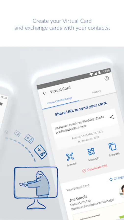 Scan your own business card as the source of your Sansan Virtual Card, Customize it and and exchange it via QR code using the Mobile App. Or use a dedicated URL to exchange cards with anyone when you, or they, don’t have a physical card on-hand.