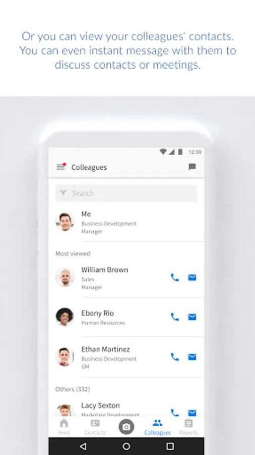 Contact information on internal colleagues (whether across teams, offices, or multiple branches) can be managed along with customer contact information imported through business cards and other sources. Interactions with prospects and customers, and with internal colleagues, can be managed via the Mobile App and in harmony with the Web App.