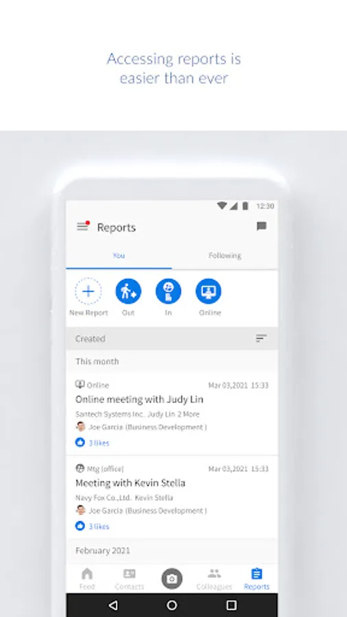 Use the app to enter reports on activity related to registered contacts. Reports recorded in Sansan can be viewed in the order they happened, so you can read up on contacts’ history before you meet with them.