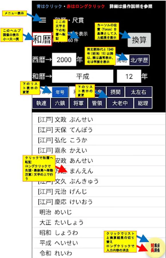 (1) The Japanese calendar displays the Western calendar ⇔ Japanese calendar conversion, Emperor, Kanpaku, Shogun, Roju, age, sexagenary cycle, educational background, and unlucky year.