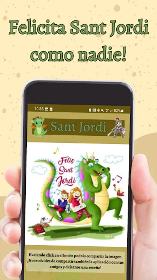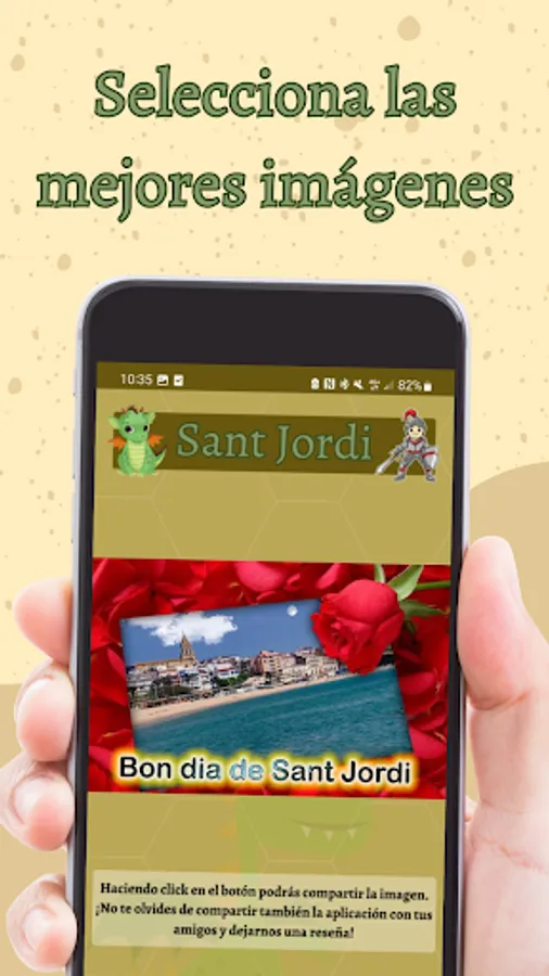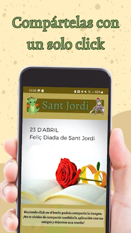 To share an image of Sant Jordi, simply select the image you want, whether it contains a book or a rose, and then choose the sharing method you prefer, such as email, social networks, WhatsApp, etc. The Sant Jordi application also allows you to add a personalized message to the image so that you can send a personalized greeting to your friends and family.