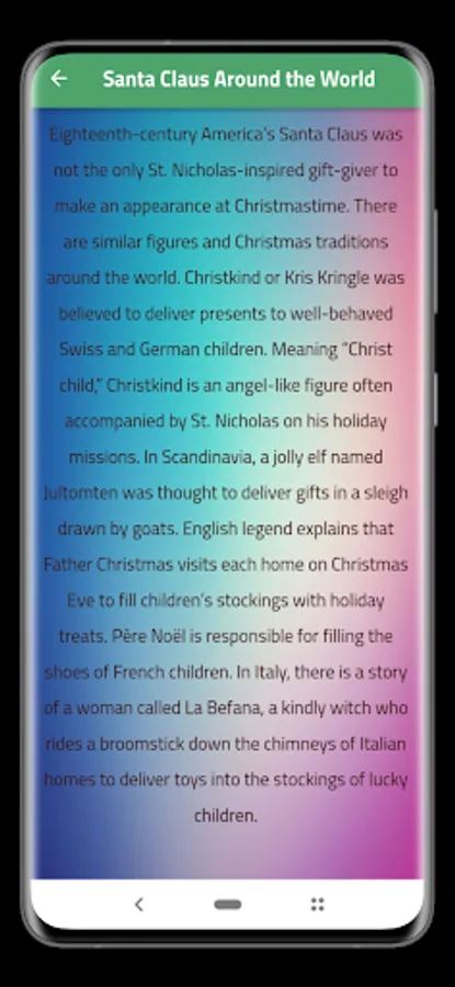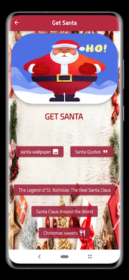 Get Santa app, will take you in a nice experience about everything interests you about Santa from santa wallpaper to santa quotes and introduce you to the legend of St. Nicholas, to the best Christmas sweets and christmas wallpapers and finally christmas songs and more.