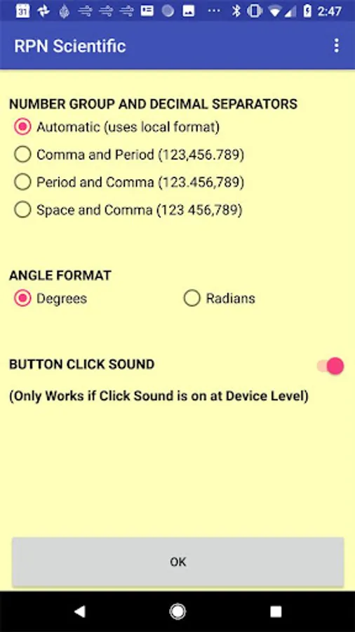 Trigonometric functions can use either radian or degree arguments. The angle format can be toggled by clicking on one of the radio buttons on the Settings page. Several common errors are trapped, such as trying to divide by zero or take the logarithm of a negative number.