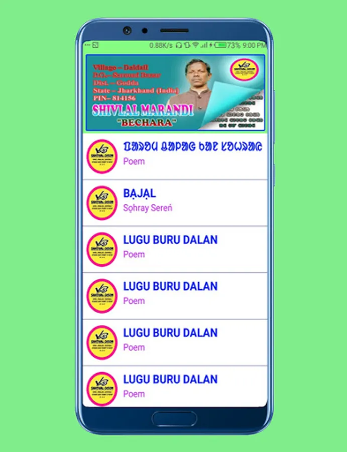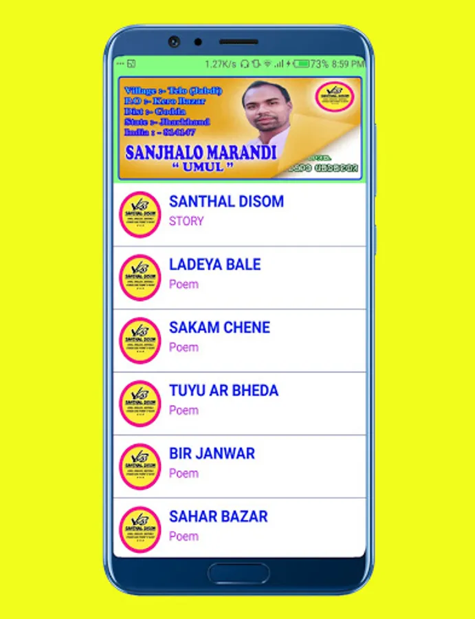 “SANTAL DISOM” is the first mobile application for Santal people. It is available now in fully Online. It is a matter of great pride for Santali language lovers that for the first time an app have been prepared named "Santal Disom". You will find stories, poems and many songs composed by Santali's two well-known litterateurs Shivlal Marandi "Bechara" and Sanjhalo Marandi "Umul". Today, man has very little time. Where does he have time to go to the library and read a book? Keeping this in mind, this "Santal Disom" mobile app has been prepared. A person can read anything he likes anywhere. If you are fond of writing, you can also join this app. The mobile number for contact is +91 8789540988 / + 91 7739839000 / + 91 9934881059.