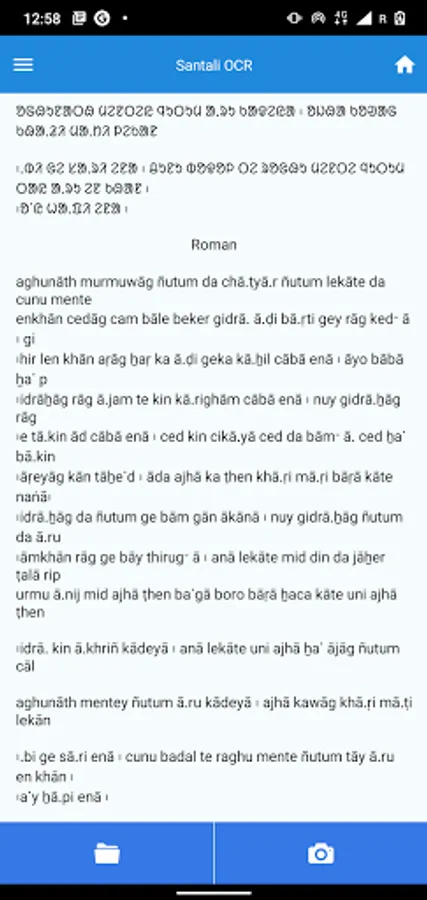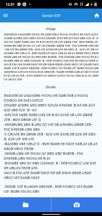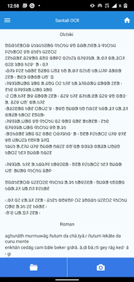 Santali Olchiki OCR - is an image to text converter and translator in word format. This app allows you to extract text from JPG, JPEG, BMP, PDF, format images and convert it into editable text both olchiki and roman. It analyzes the text in images that you upload and converts into text that you can easily read, save, or share.