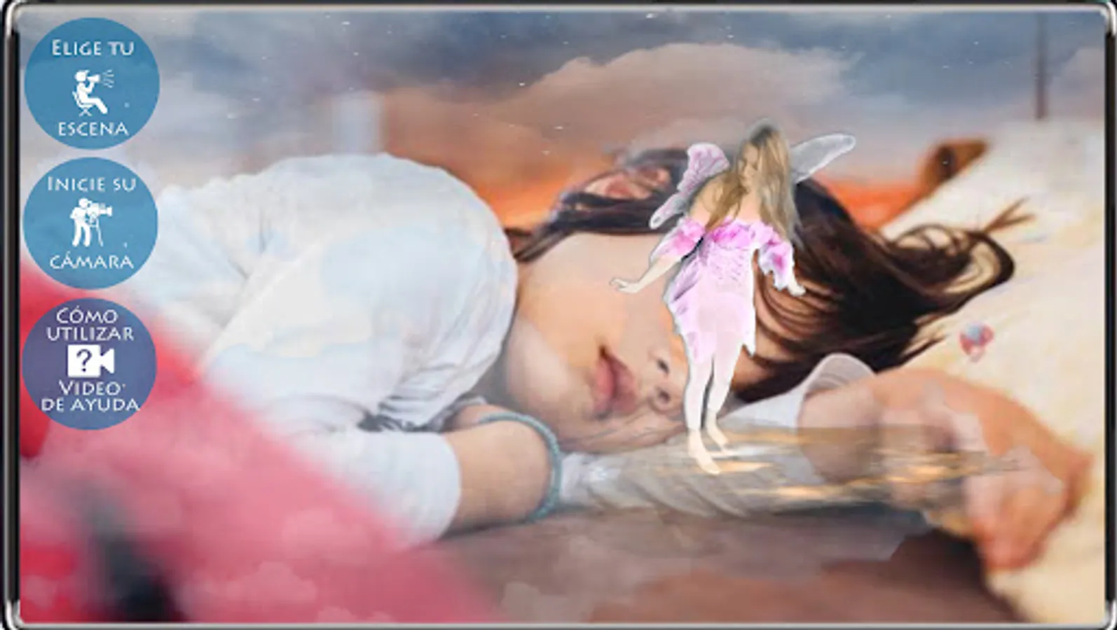 Tap 2) Then you launch your camera and line up your shot. Your camera will appear behind the fairy tale scene so it's easy to get the perfect shot.