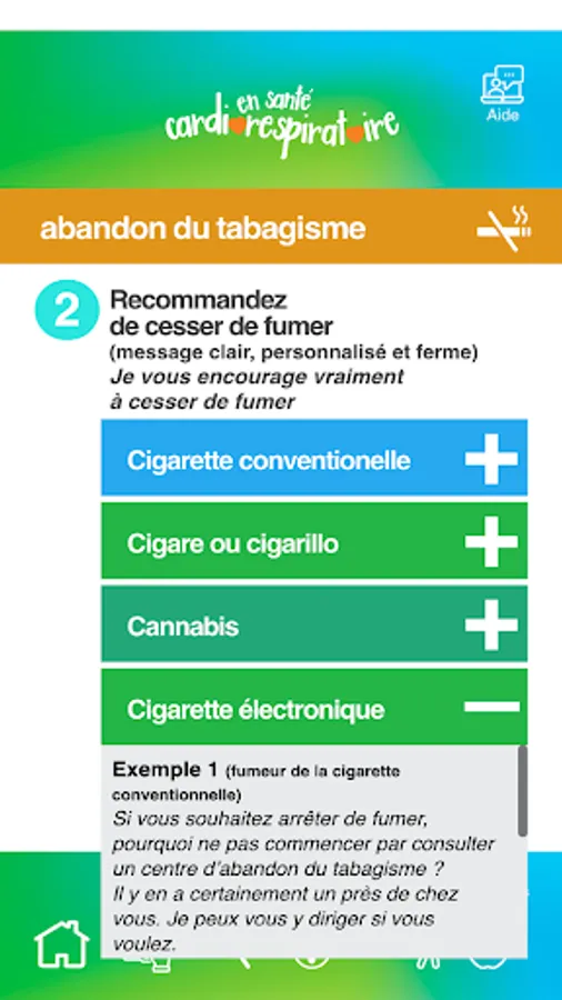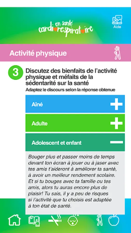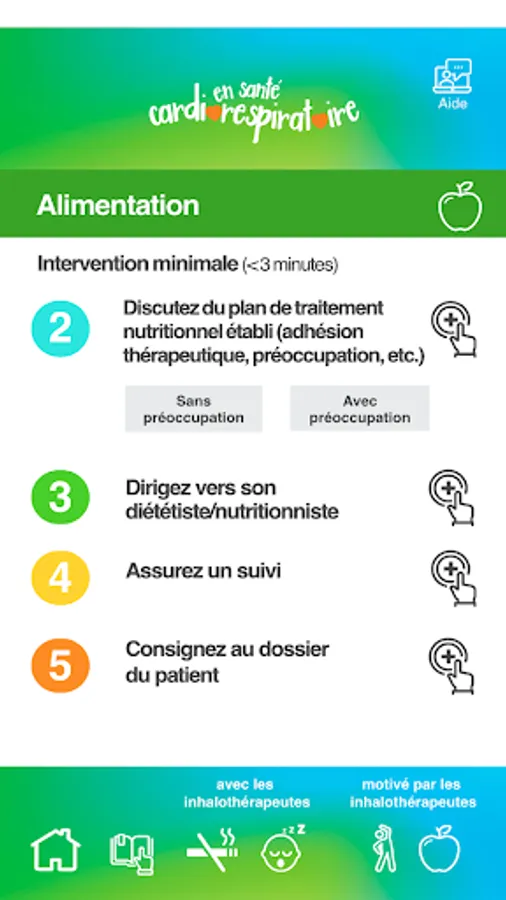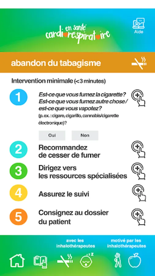 Développé en continuité du programme «En santé cardiorespiratoire», cet outil aidera l’inhalothérapeute clinicien qui n’intervient pas souvent en saines habitudes de vie auprès des patients ou qui souhaite améliorer l’efficacité de ses interventions. L’application propose un exemple d’intervention minimale (< 3 minutes), des exemples de dialogues ainsi que des ressources et des astuces pour quatre comportements liés aux saines habitudes de vie (abandon du tabagisme, hygiène du sommeil, activité physique et saine alimentation), et ce, pour les clientèles pédiatrique, adulte et gériatrique.