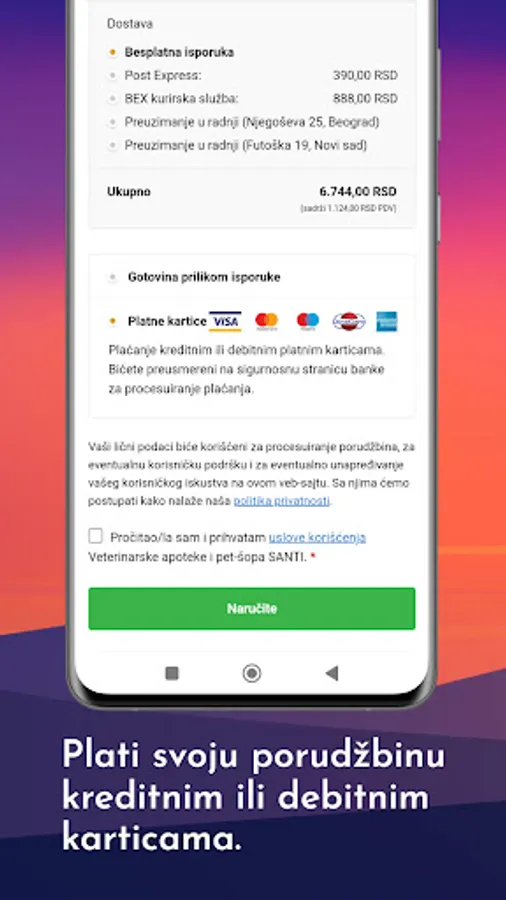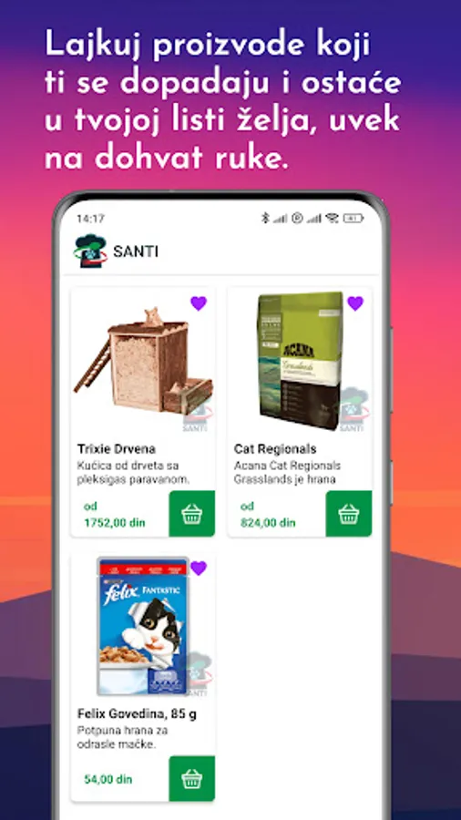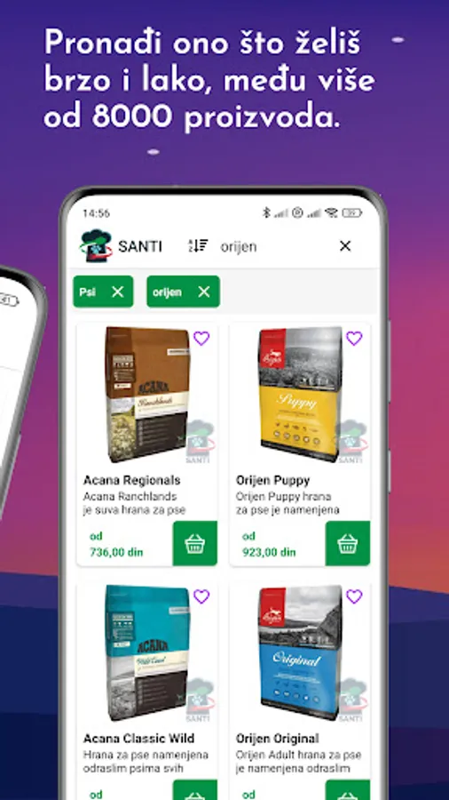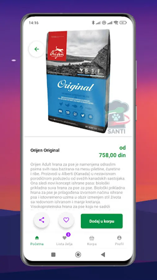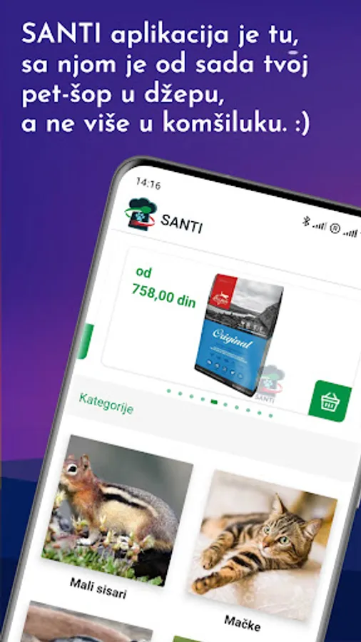 SANTI is an application for buying food, equipment, etc. pet products. The application provides a unique user experience. Shopping is quick and easy, payment is also possible with payment cards, with cash upon delivery. The assortment is extremely rich - over 8000 products for dogs, cats, birds and small animals.