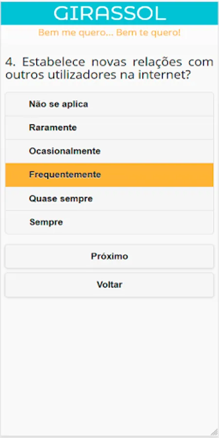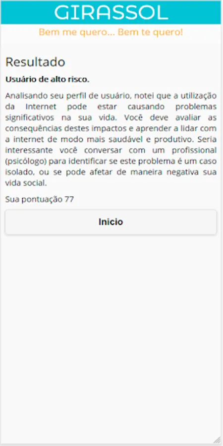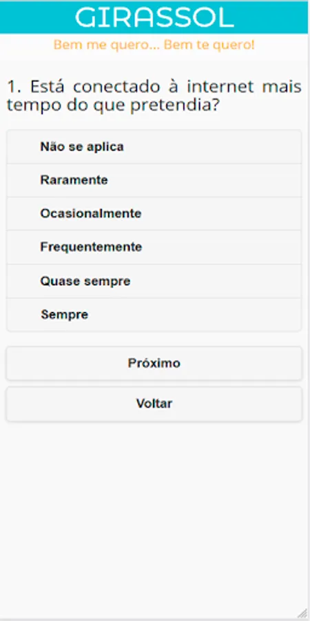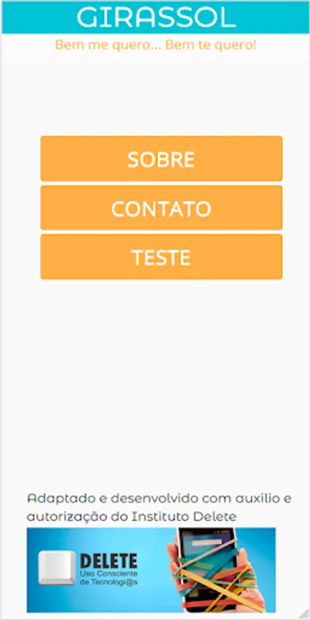 The basic questionnaire for this application was a test created by psychologist Kimberly Young, provided by the Delete Institute, and adapted by Karlla D. Souza with the help of psychologist Anna Lúcia King, from a test available on the Delete Institute website.