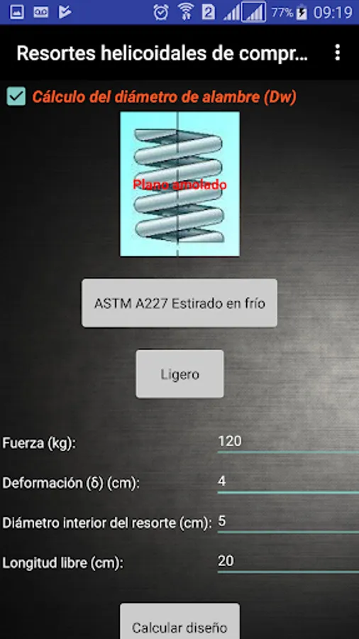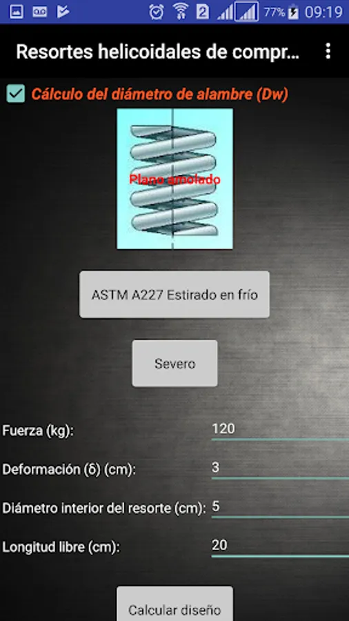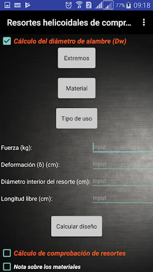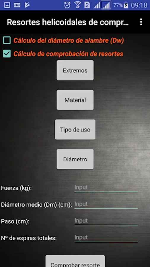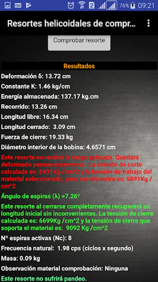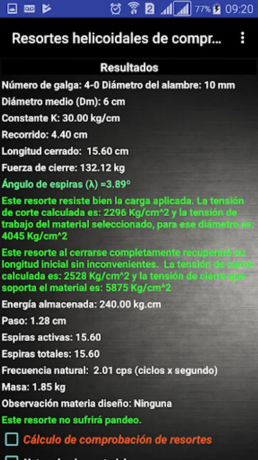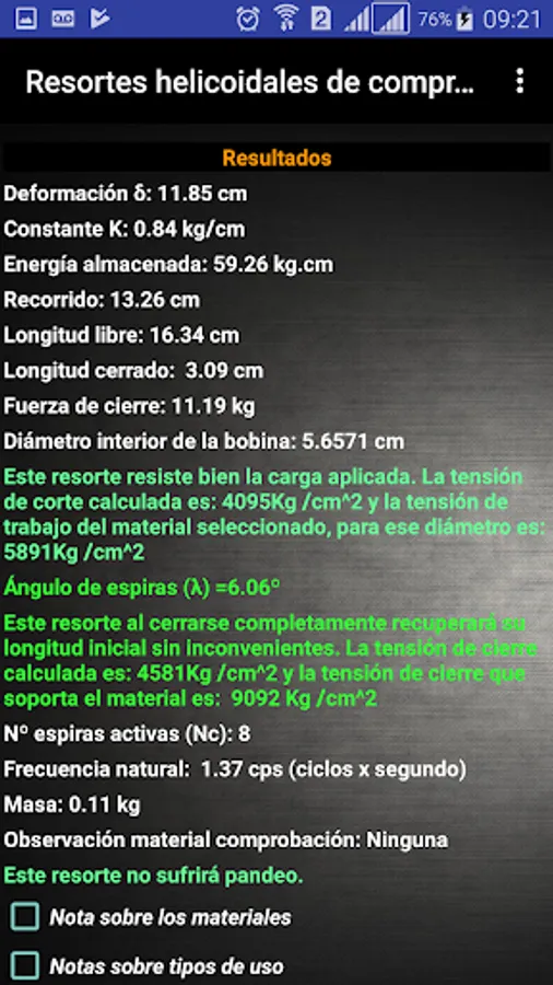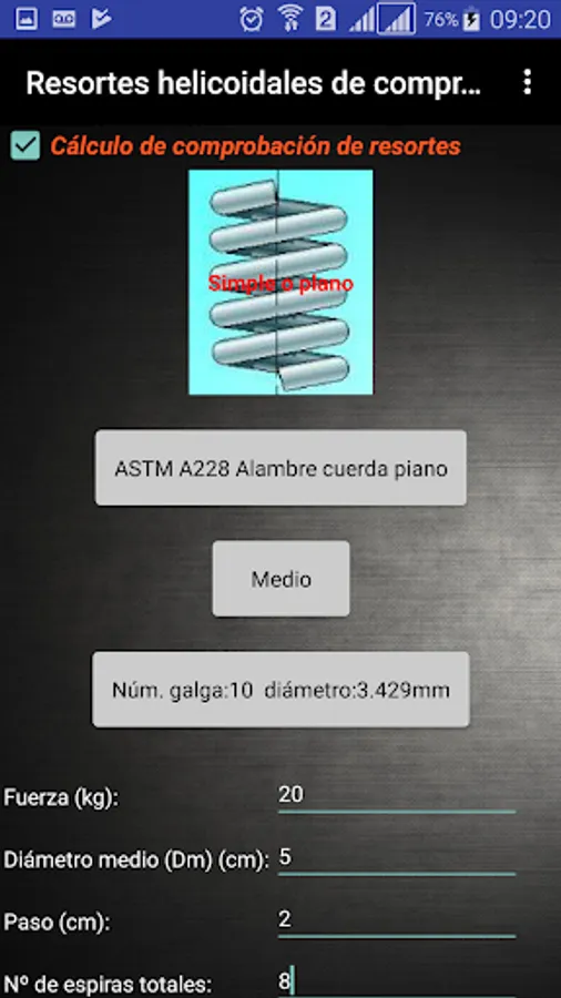 * It has a database of materials most used for springs, with the admissible and closing resistances for each diameter and type of service for a maximum diameter of 12.7mm.