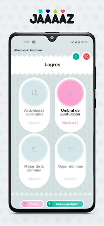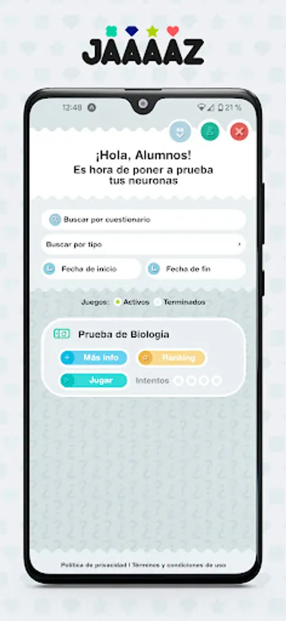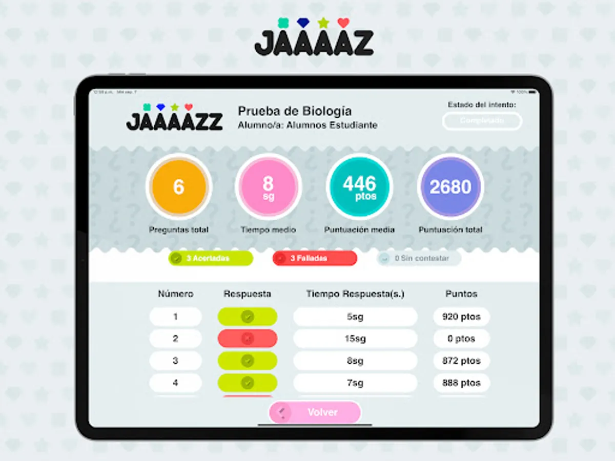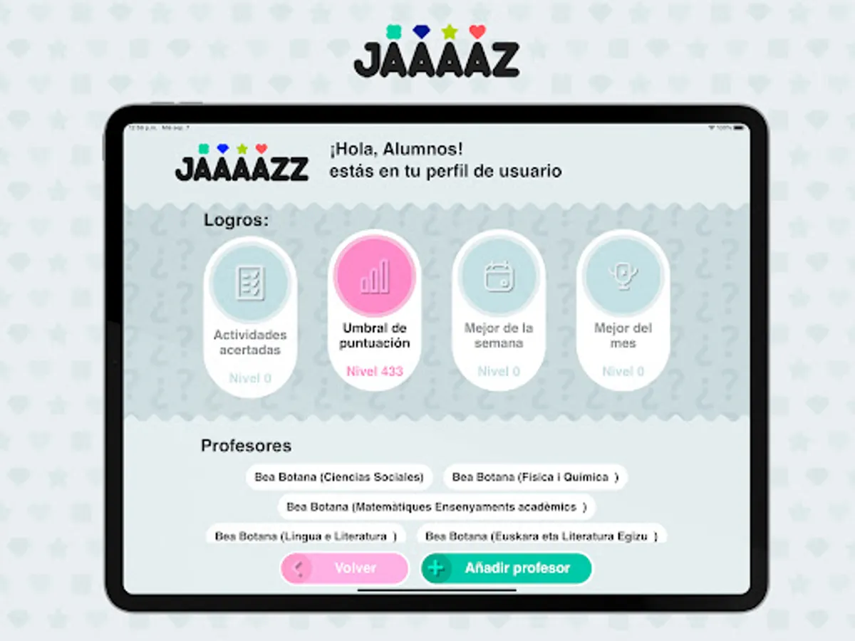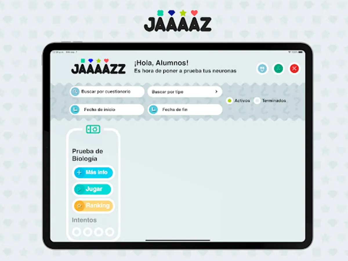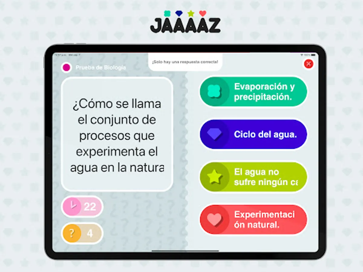 Jaaaazz is a digital complement to Santillana's Secondary Education books corresponding to the Building Worlds series: it is a web application to carry out instant interactive tests. The teacher can use the preloaded tests (or use their own created within the application) to carry out a group activity in class. To do this, students must have a device with an internet connection.