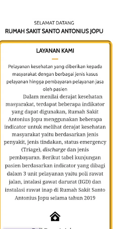 St. Antonius Jopu Hospital was founded by the Archbishop of Ende, Mgr. Antonius Theisen in 1961. At its inception, this hospital was a Medical Center and Center for Maternal and Child Health (BP/BKIA) with a capacity of 45 beds. Santo Antonius Jopu Hospital is located in Jopu village, Wolowaru sub-district, Ende district, East Nusa Tenggara province. This hospital was started by the Santo Lukas Ende Health Foundation and managed by the Sisters of the CIJ Congregation (Congregatio Imitation Jesu) with the aim of serving the people / communities in the Archdiocese of Ende under the supervision of the Wolowaru Health Center Doctor. Along with the passage of time and the increasing need for public health services, the Archdiocese of Ende brought in a doctor, namely dr. Paulus The (The Gwan Tjaij) on September 1, 1967. From September 1, 1967 until 1970 dr. Paulus The struggled to upgrade the status of BP/BKIA to a hospital by forming a Medical Bureau Organization with the Vikjen Archdiocese of Ende.