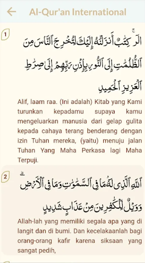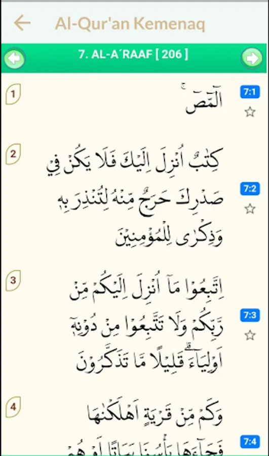 This Qur'an application is also available in the Ministry of Religion's version of the Qur'an and the international Qur'an. And this application also supports reading features in Latin writing and reading in Arabic script. If the reader feels disturbed by the existence of a translation of the Qur'an in this application, then the reader can press the hide translation button, so that the reader can read more freely.
