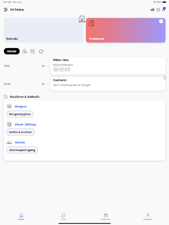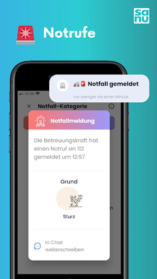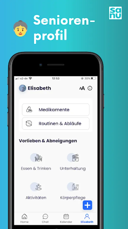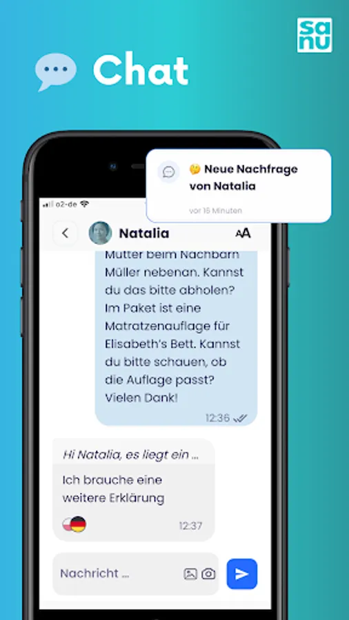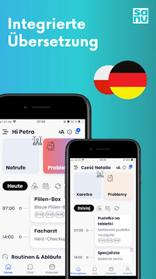 The special thing about sanu: All functions in the app have an integrated translation. Any content that you and the caregiver share will be automatically translated for both sides. In seconds and in the highest quality.
