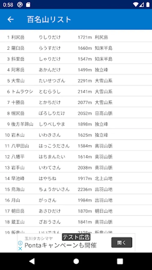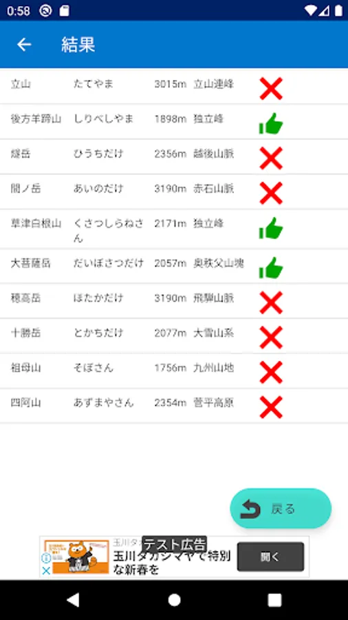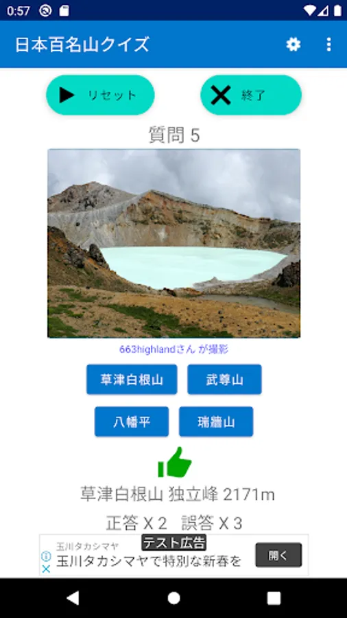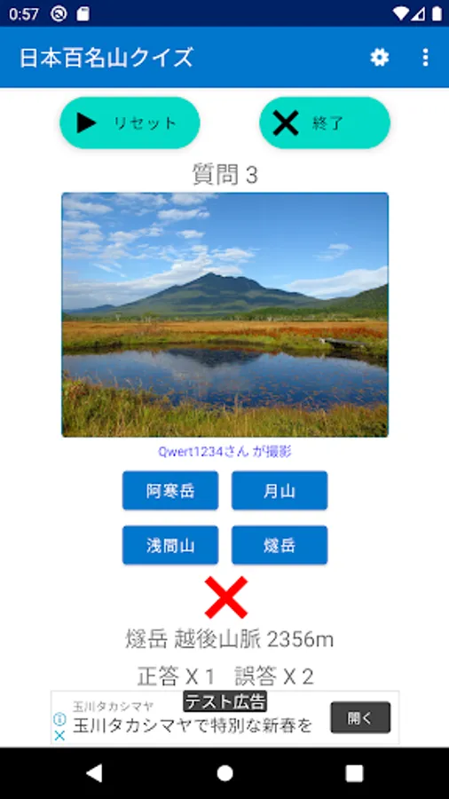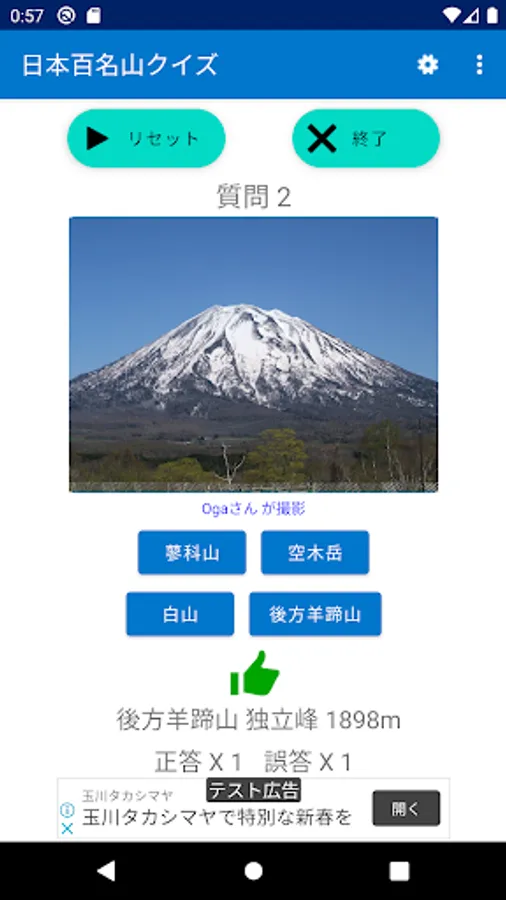 A quiz to guess the mountain name with 4 choices from the pictures of 100 famous mountains in Japan.