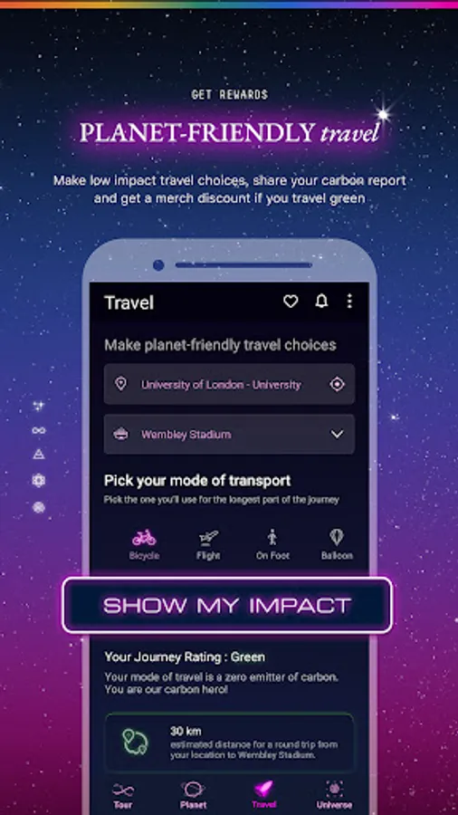 ● Use the app to make informed choices on how you travel to the show. The app’s carbon calculator will estimate your CO2 emissions to and from the concert, based on your selected means of transport. Choose sustainable travel options and get a discount code for tour merch.