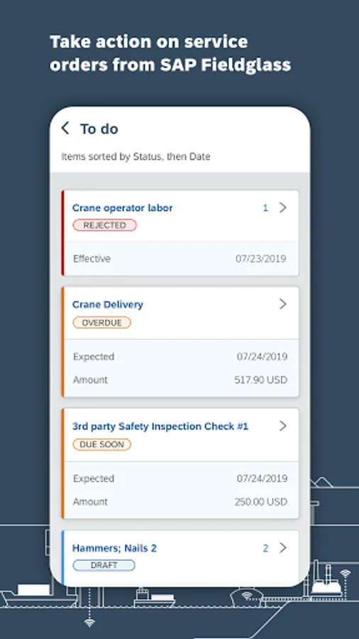 Designed for use by field service workers who have an existing SAP Fieldglass account, SAP Fieldglass Service Orders makes it possible to manage tasks directly from their mobile device. Users can view their assigned work items and tasks, mark items complete, and attach and enter a description for supporting documentation.