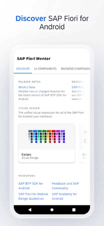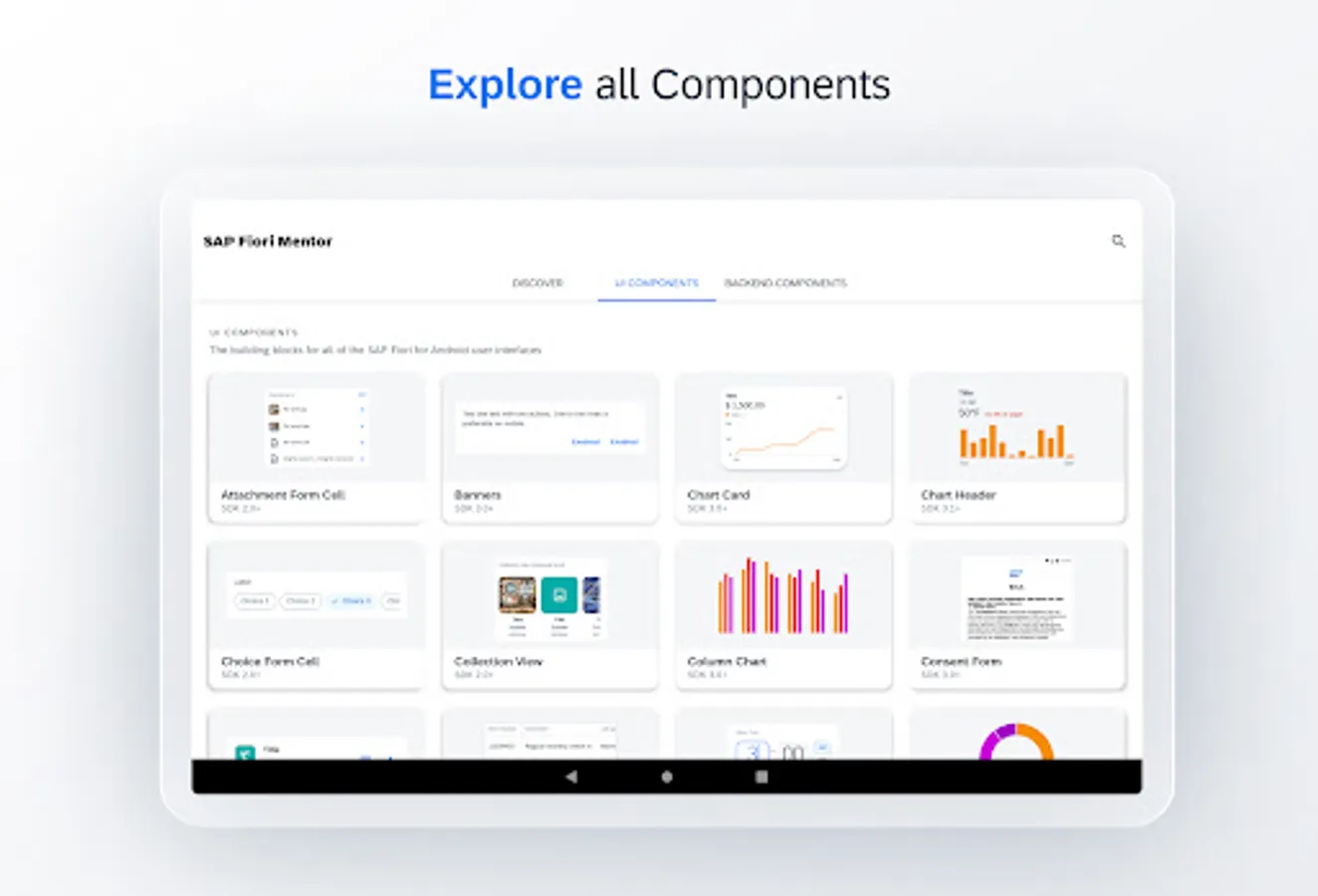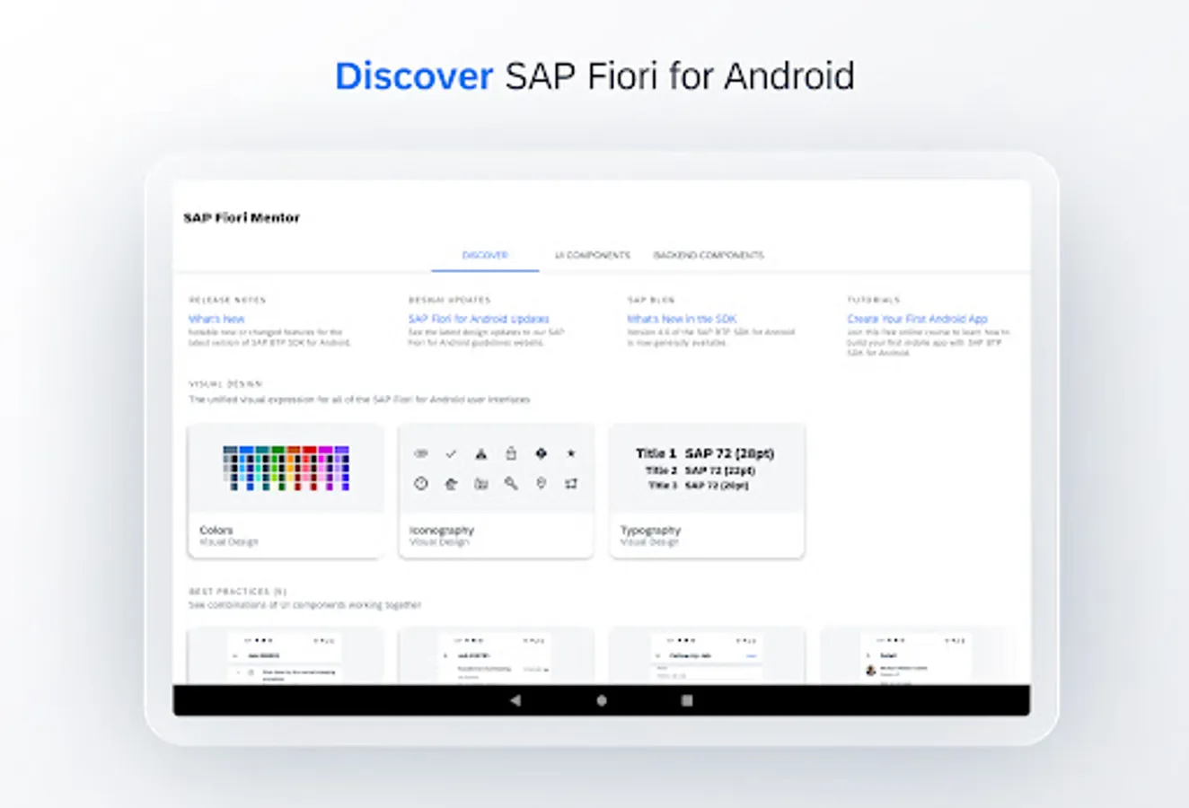 With the SAP Fiori Mentor mobile app for Android, you can access interactive documentation anywhere and anytime. This app, which is optimized for tablets, connects to the SAP BTP SDK for Android and allows designers and developers to streamline the creation of SAP Fiori apps on Android, view live previews of all UI components, and change parameters to see the effect immediately.