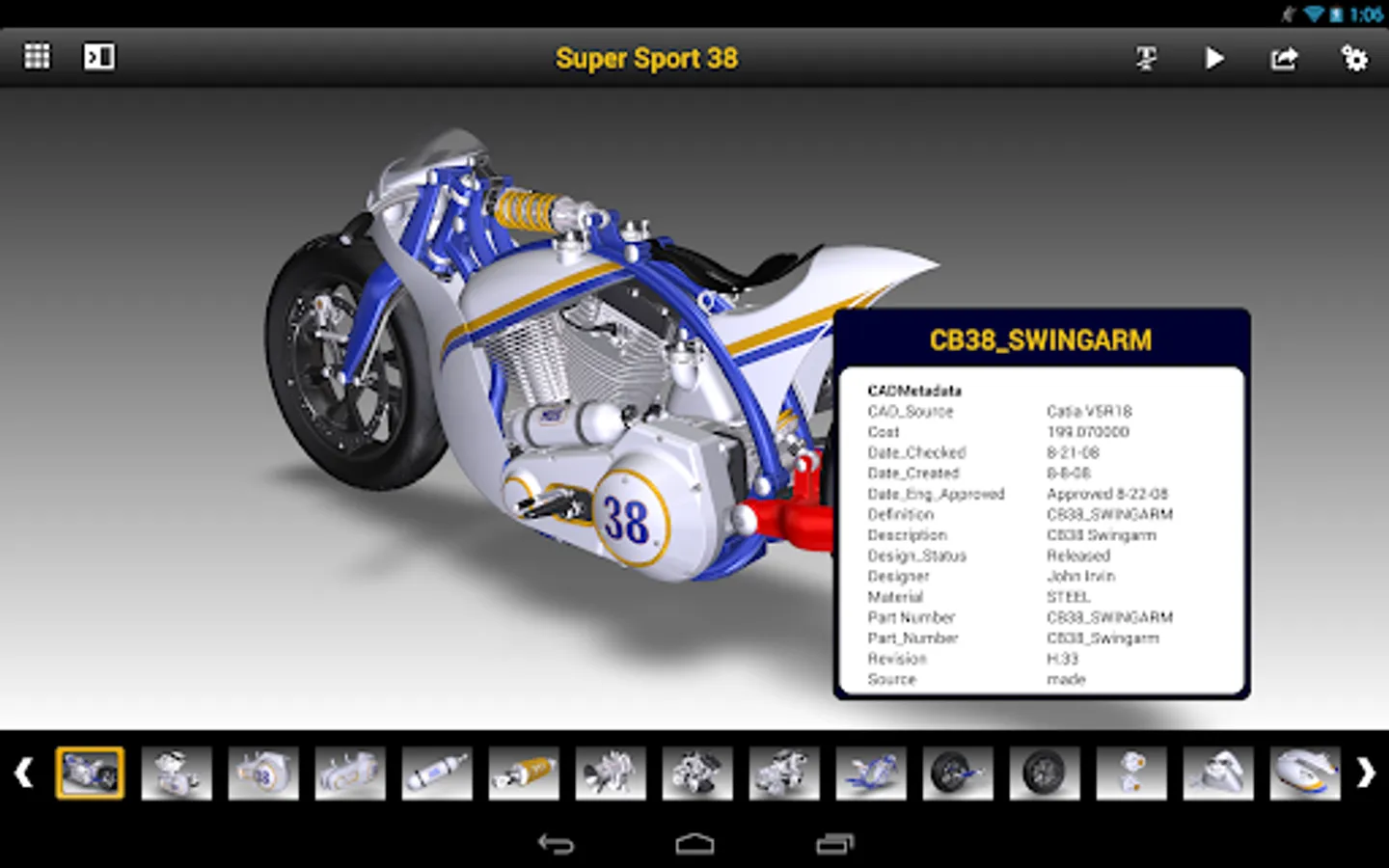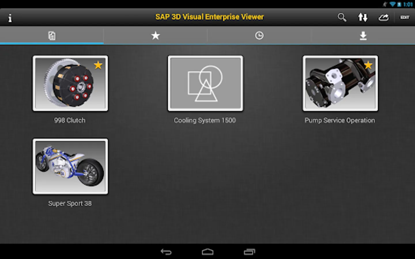 Note: Data loaded using the SAP 3D Visual Enterprise Viewer mobile app is stored on the Android device. Several example files are included with this app. These files can be loaded and viewed by simply tapping on a file thumbnail.