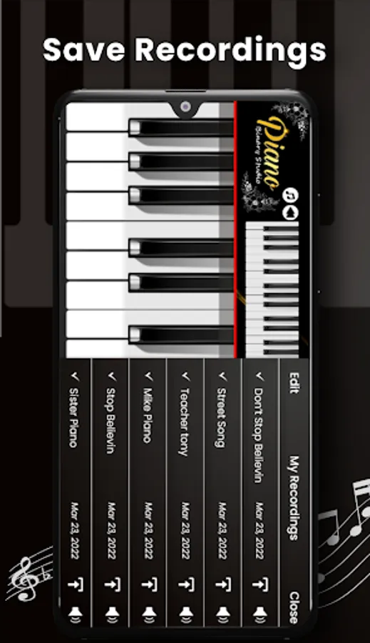 When using the APP, you select the keys to play music and record the piano keys as well. Every key has a different beat from the other and after playing the piano, you become the best piano player. Furthermore, Rich, wispy, and similar to accordion playing beats can be created. After recording the tune, you created, you can enjoy the playing you created. Play a piano and made various notes, record and listen.