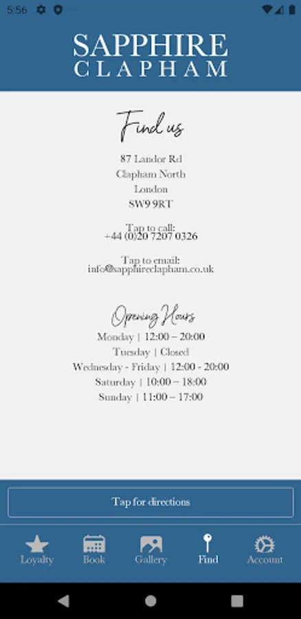 The Sapphire Clapham app is for customers and patients of Sapphire Clapham. The app includes a loyalty card, social media links and first access to exclusive vouchers for use at Sapphire.