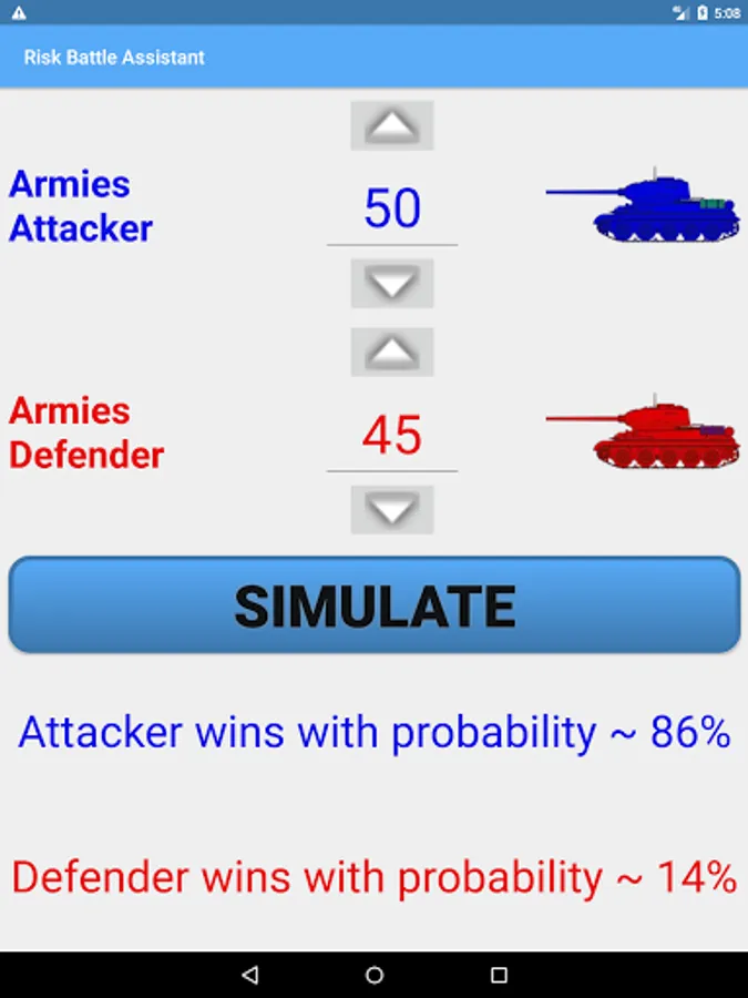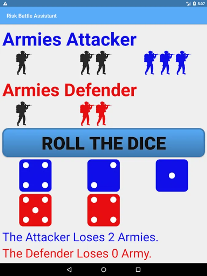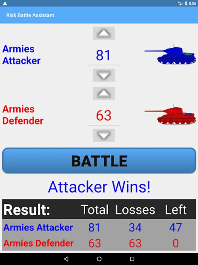 Playing Risk and rolling the dices is fun. But often battles and games are tough because of very long time rolling the dices. This is the idea behind the Risk Battle Assistant, to shorten up battle times and increase gaming fun. You only must enter attacker and defender numbers and the app does the rest. The app provides several features and functionality in context of Risk Game.