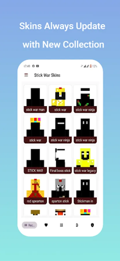 you can find a variety of stick war skins in this application including: stick war man, stick war super ninja, stick war swordmen, stick war ninja, sparton stick war and many other collections of skins.
