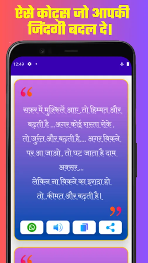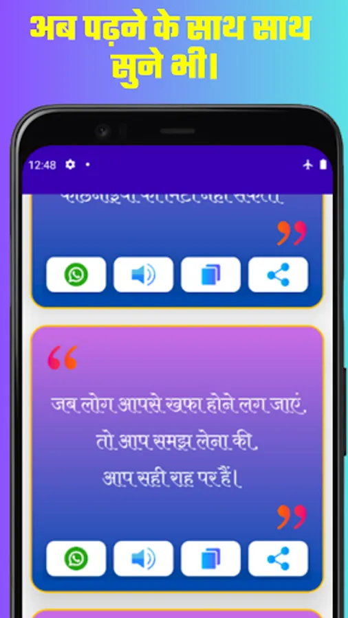 इस ऍप में हमने शेयरिंग का फीचर भी डाला हुआ है। जो कोट्स आपको पसंद आते है, वो आप अपने दोस्तों के साथ बड़ी आसानी से शेयर कर सकते हो। अगर आपको कोई क्वोट कॉपी करना है तो वो भी आप कर सकते हो। इसके अलावा साउंड के आइकॉन पर क्लिक करके आप ये सारे कोट्स सुन भी सकते हो। ये कोट्स रोज सुनने और पढ़ने से आपका जीवन बदल सकता है।