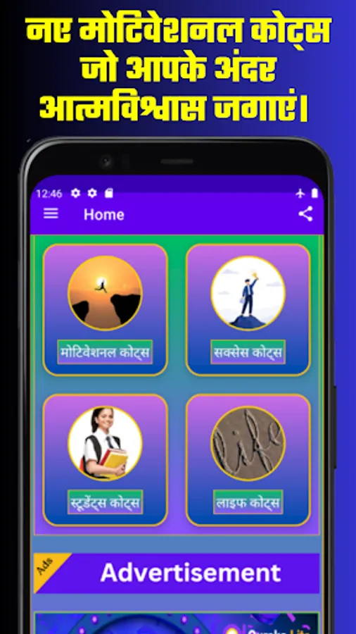 इस ऍप में आपको ढेर सारे मोटिवेशनल कोट्स (Motivational quotes in Hindi) मिलेंगे जो आपको आपके जीवन में सफलता पाने के लिए मदद करेंगे। मोटिवेशनल कोट्स को हमने चार हिस्सों में बात है।