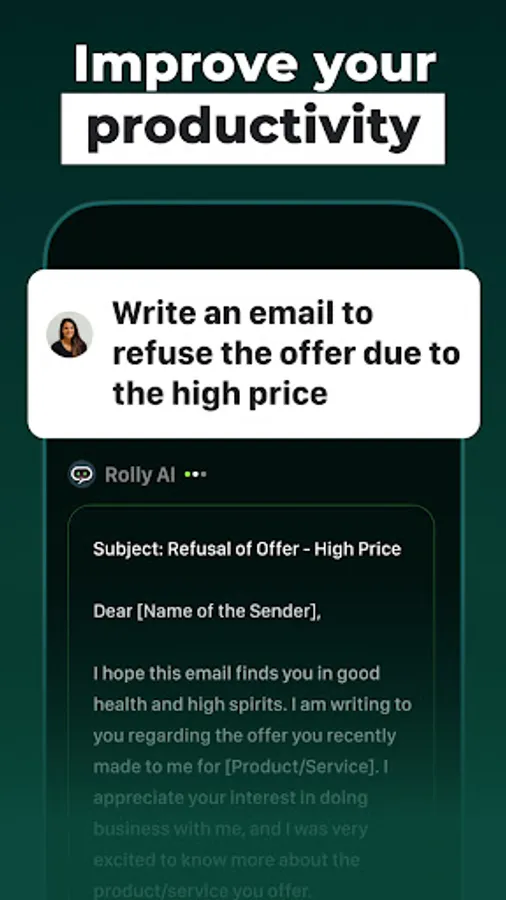 Discover a new era of communication and productivity with ChatGPT, a state-of-the-art AI chatbot designed to revolutionize how you interact, learn, and accomplish your goals. Backed by OpenAI's advanced technology, Rolly aims to be your ultimate personal AI assistant, friend, and conversational partner, all accessible through a user-friendly app.