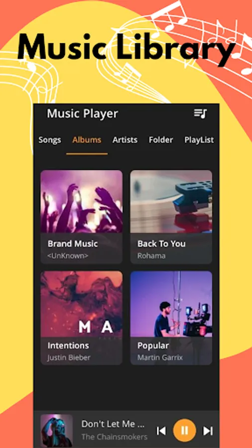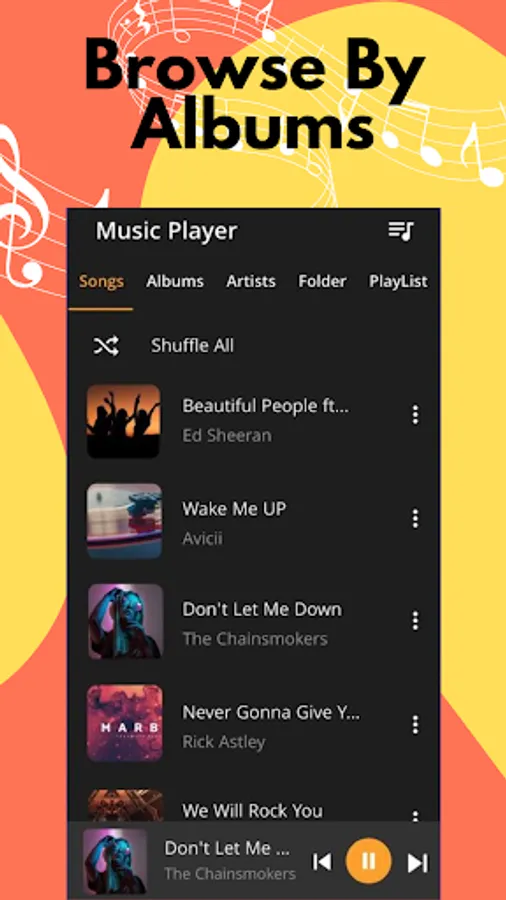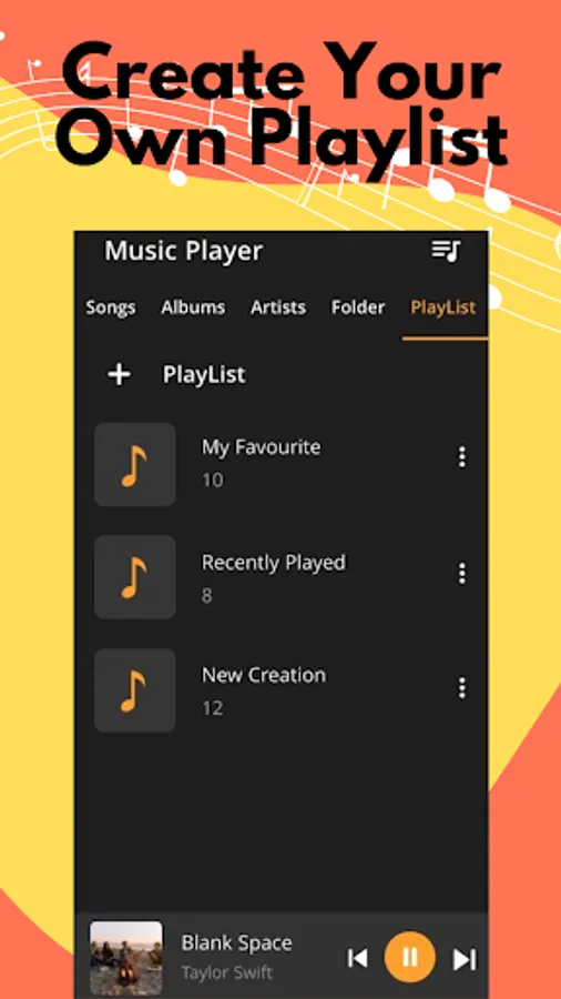 Quick Music Player gives you also the chance to make your music list inside the app. Create and manage your playlist as you desire. You can take your songs from your phone and SD card. Furthermore, you can add folders easily.