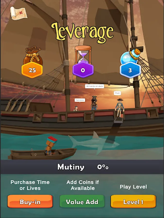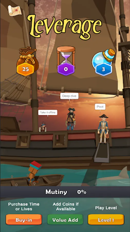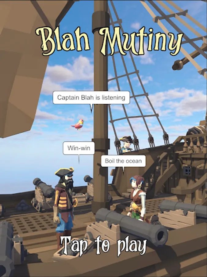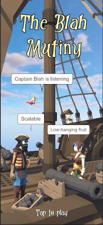 Captain Blah has spread his unbearable corporate jargon to the pirate town of Port Loyal. You are the pirate hero who will incite a mutiny of Captain Blah and rid the town of corporate buzzwords like pivot, scalable, verticals, win-win, synergy, leverage, best practice, give 110%, disrupt, game changer, rockstar, bio break, unpack, giving time back in your day, influencer, hard stop, swimlane, best in class, learnings, ideate, pain point, holistic, bottom line, think outside the box, low-hanging fruit, circle back, take it offline, deep dive, bandwidth, fit for purpose, next-gen, net-net, boil the ocean, open the kimono, socialize, omni-channel, empower, in the weeds, on your radar, optics, mindshare, touch base, organic growth, put a pin in it, actionable, etc, etc, etc.