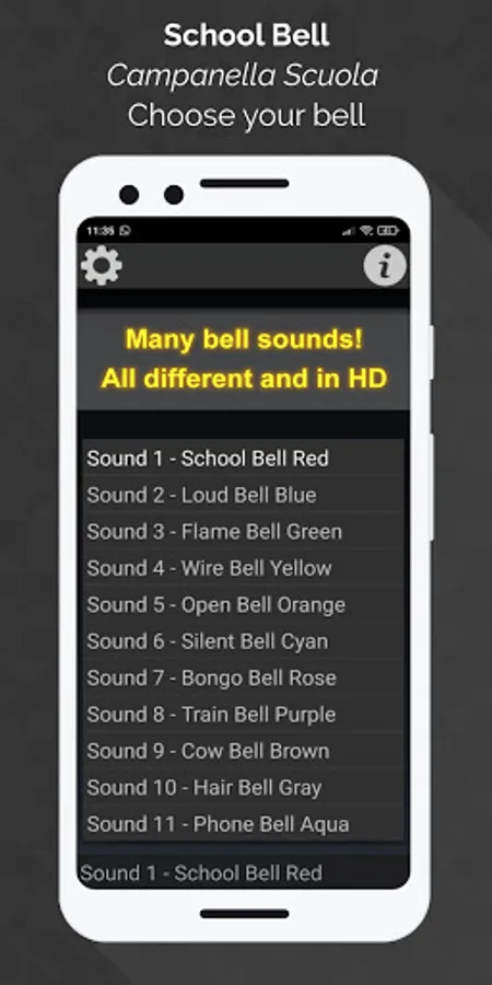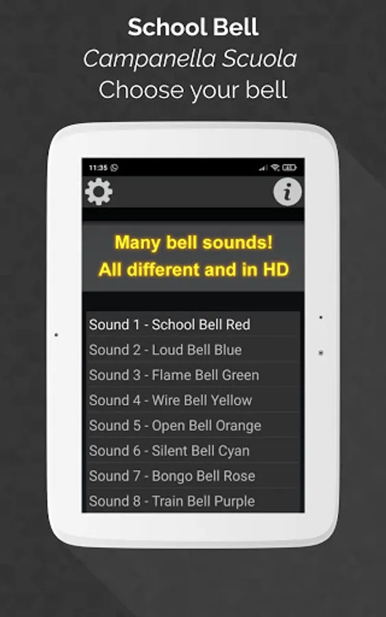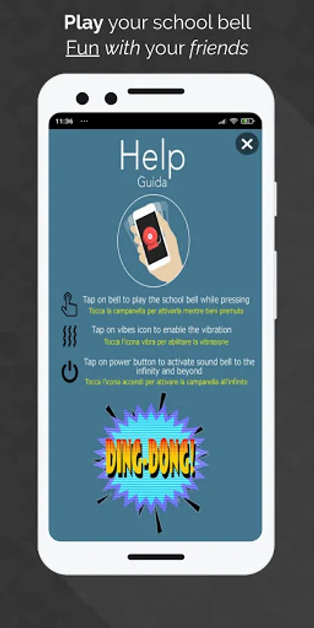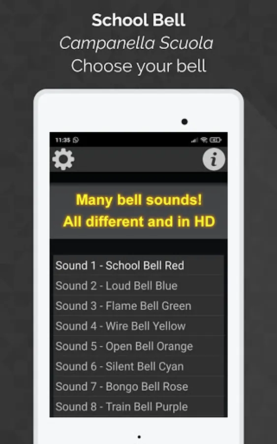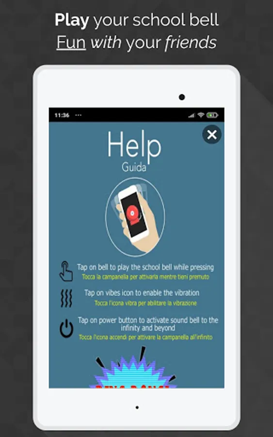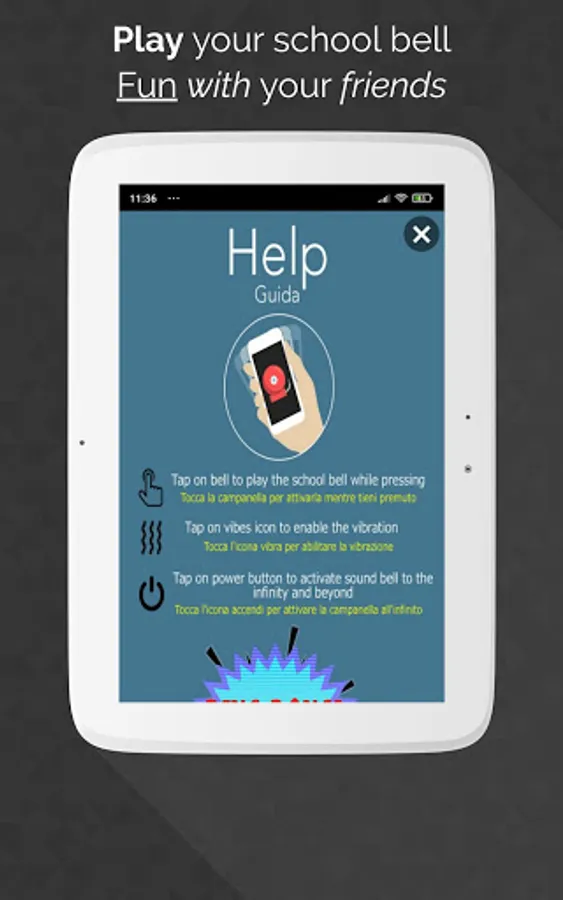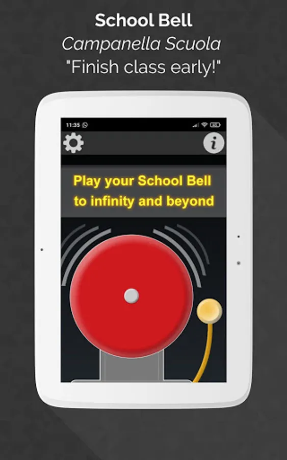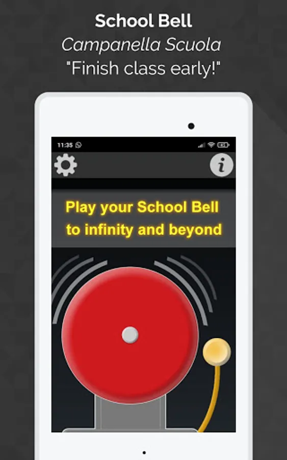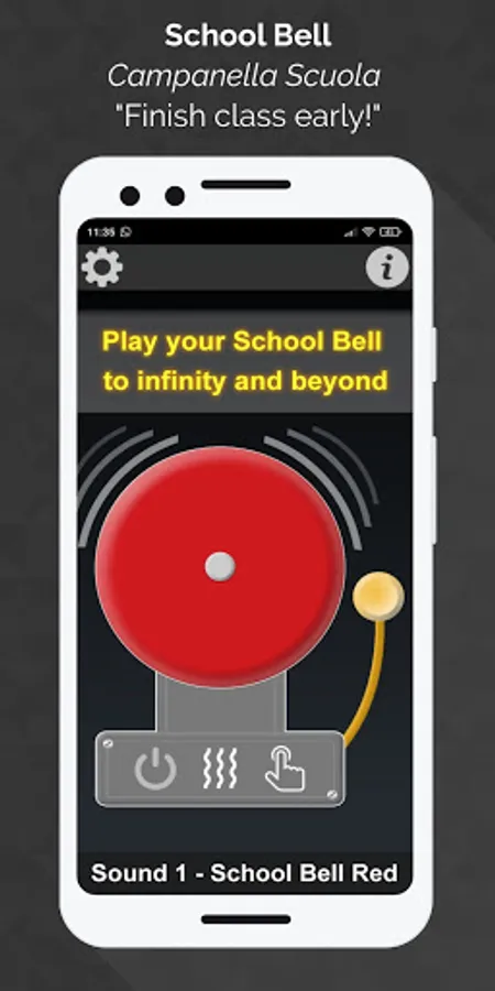 Tap on bell to play the school bell while pressing or tap on power button to activate sound bell to the infinity and beyond.