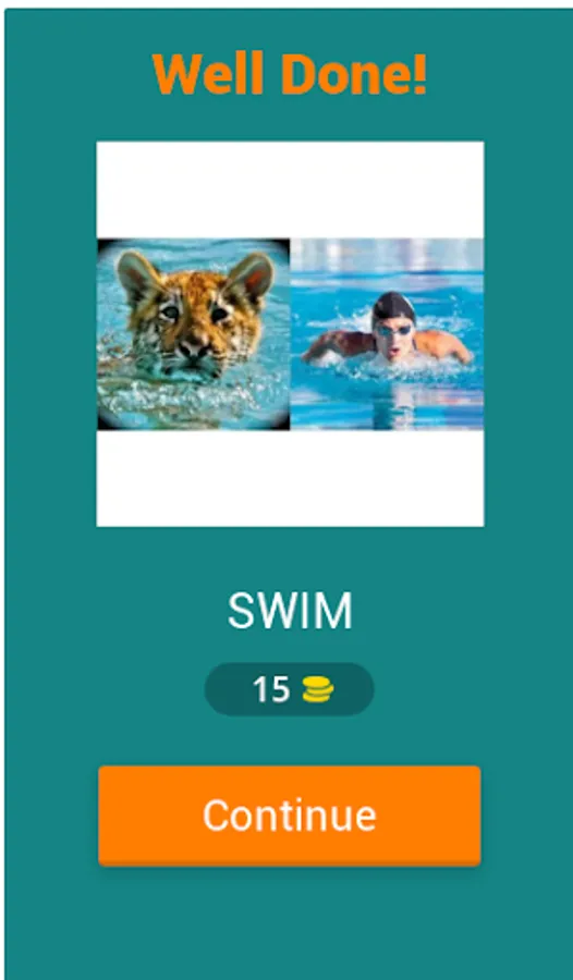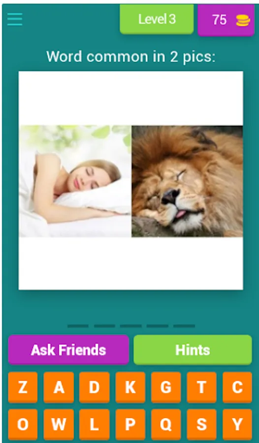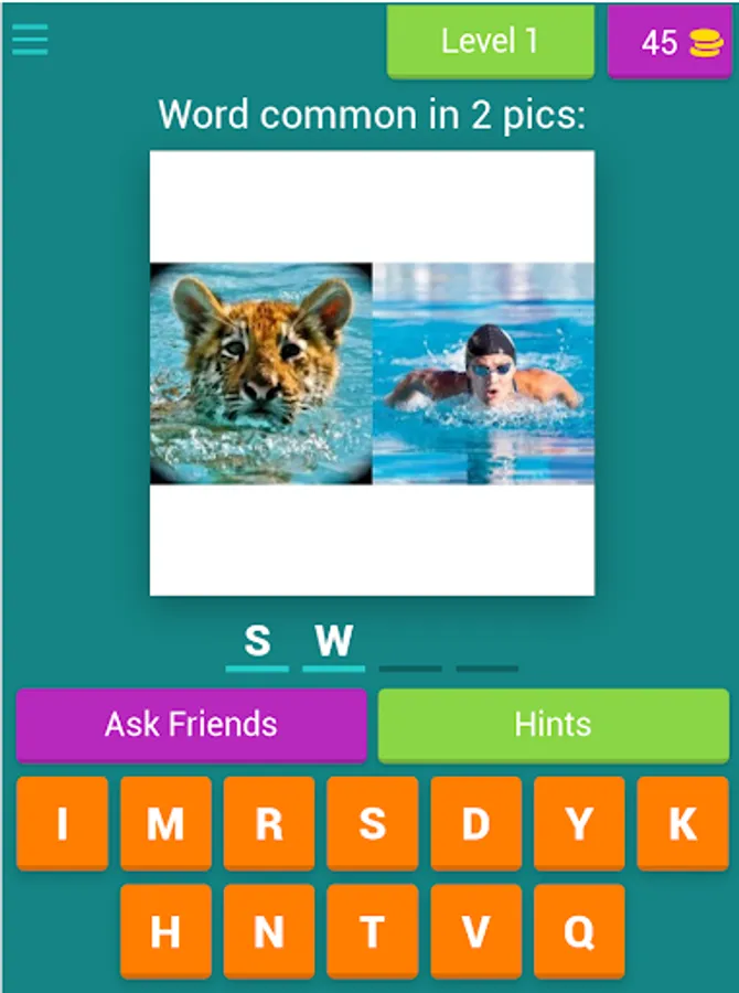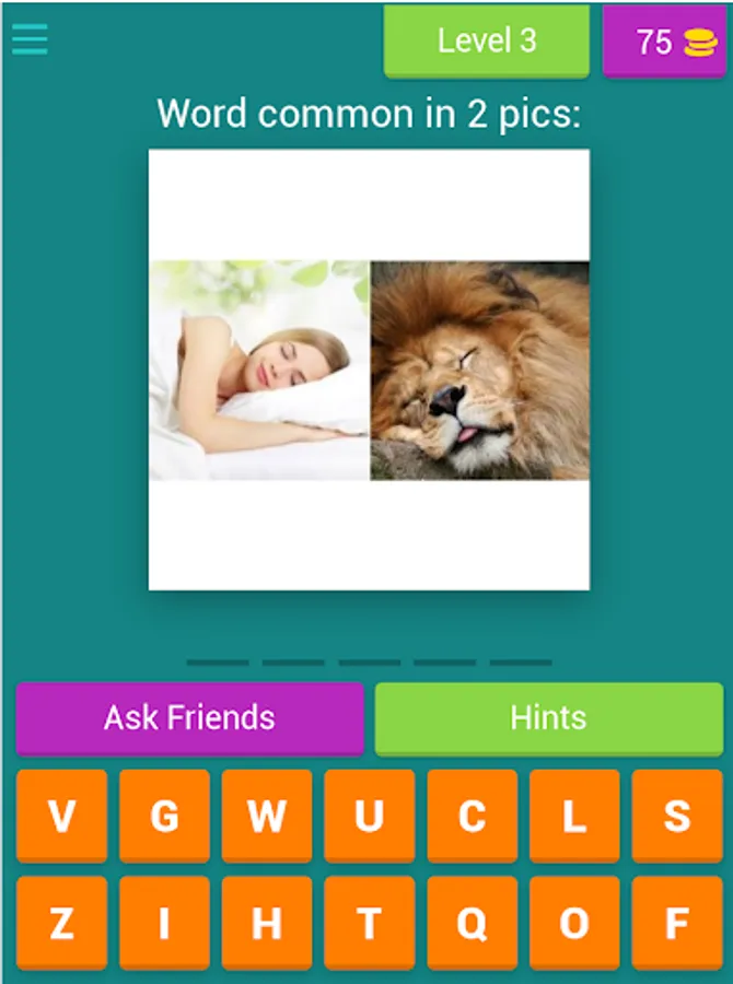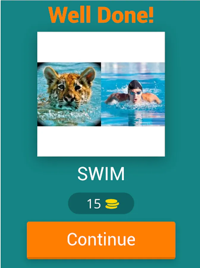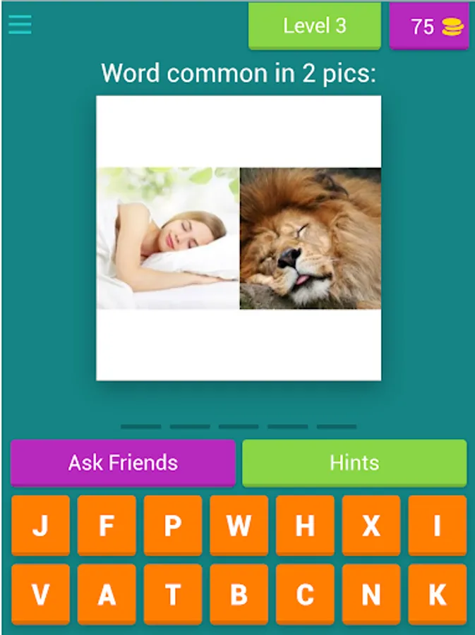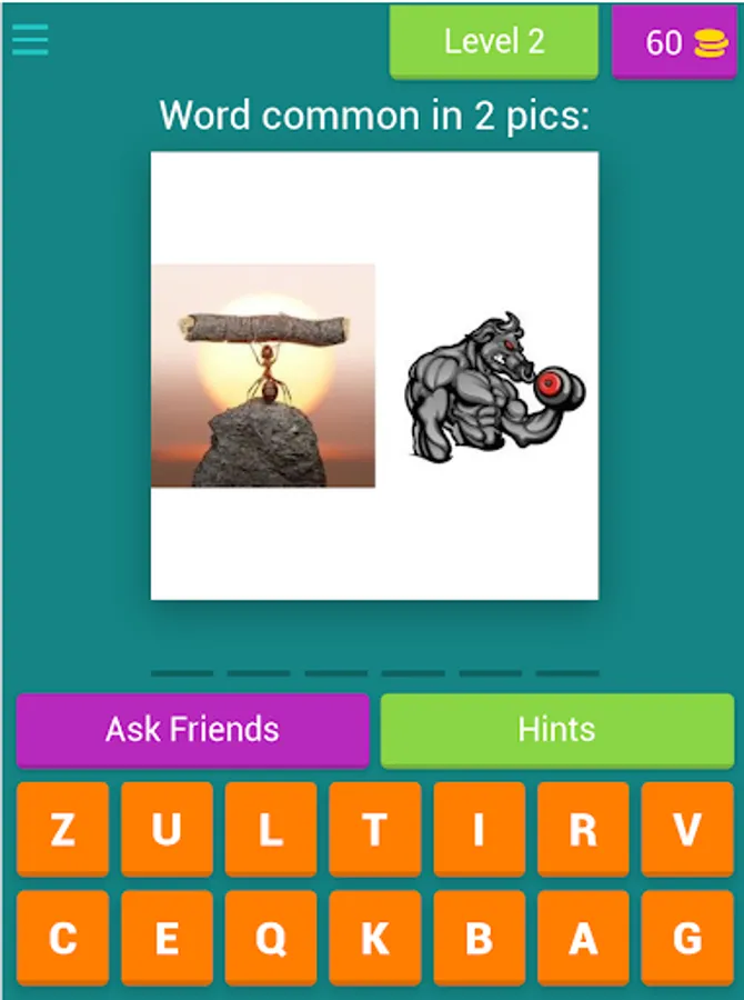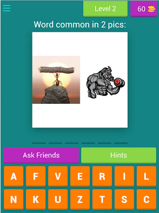 Find out the word that is common in two pictures and type it in the space by selecting letters displayed on the screen. When the answer is right, move on to the next level.
