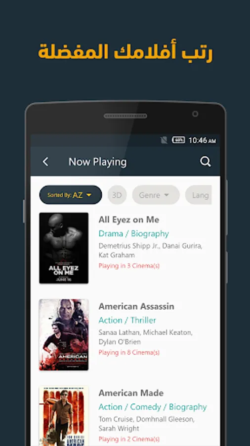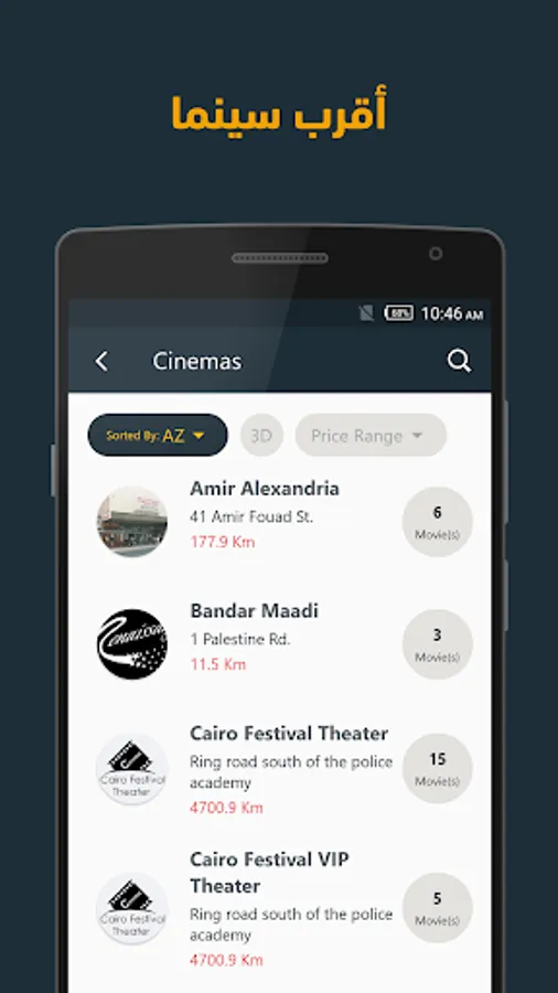 - إنشاء قائمة دور العرض المفضلة لك وسهولة الوصول إليها ومعرفة الأفلام المعروضة بها حاليًا في أي وقت.