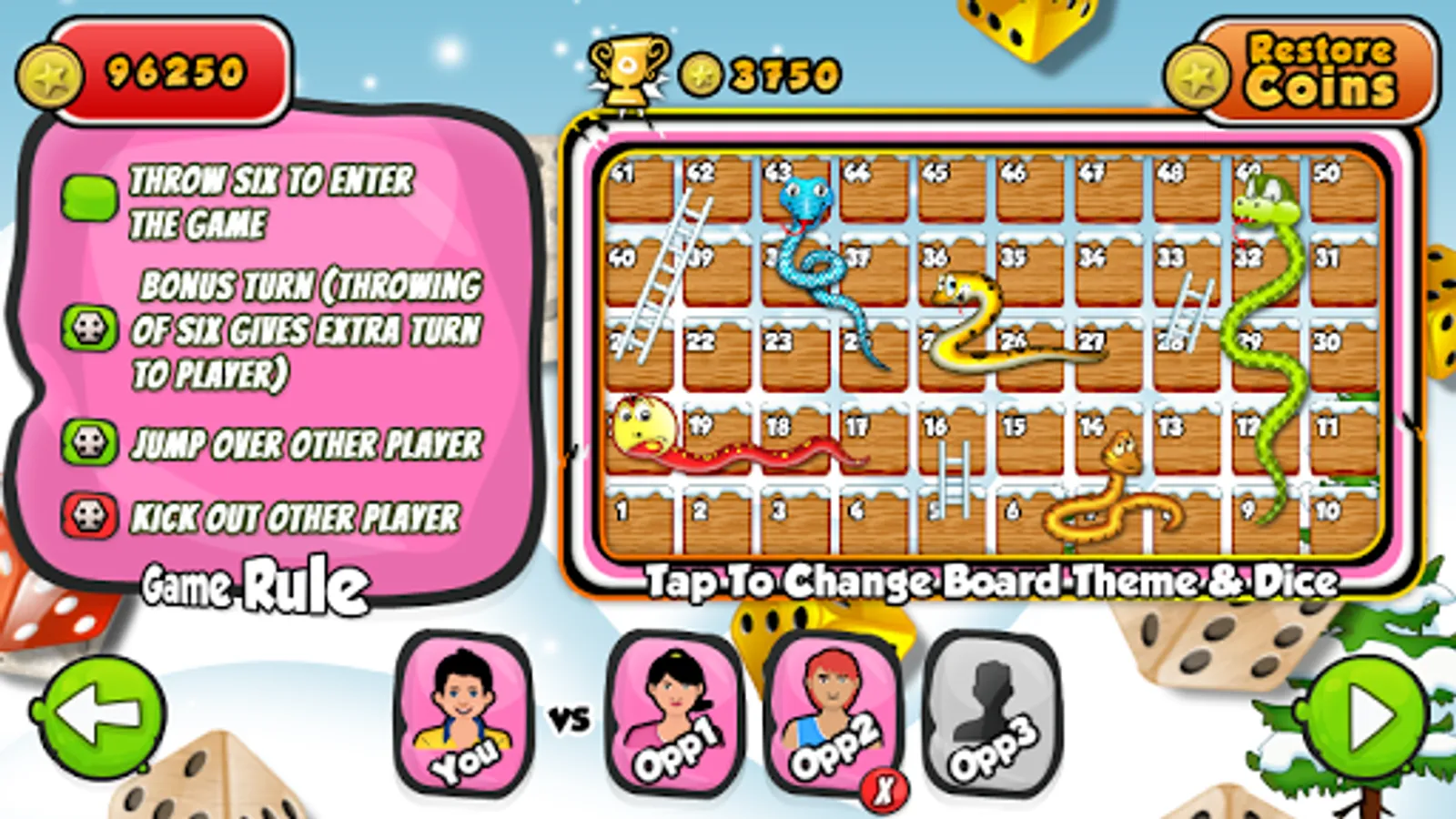 Snakes and Ladders is a classical board game that has enthralled generations of children and often their parents too!. Have hours of endless fun with this game and feel the thrill of climbing up the ladder, sliding down through the snake and kicking out your opponent on your android device.