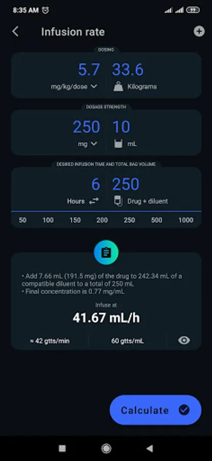 • Maintenance infusion — Enter desired dose, weight (kg/lb), drug amount (g/mg/mcg/units) and diluent volume to get infusion rate, desired infusion time, drip rate, drop interval and drug concentration. You can also get the drug dosage from the infusion rate.