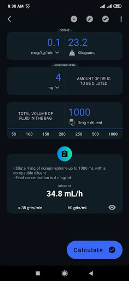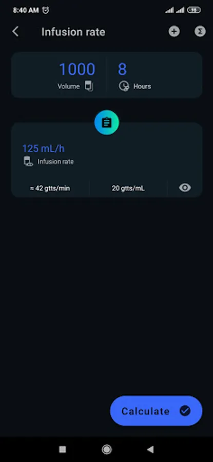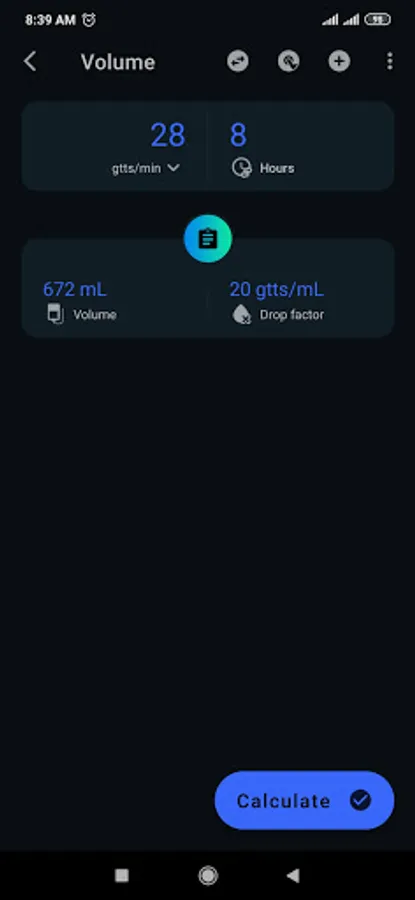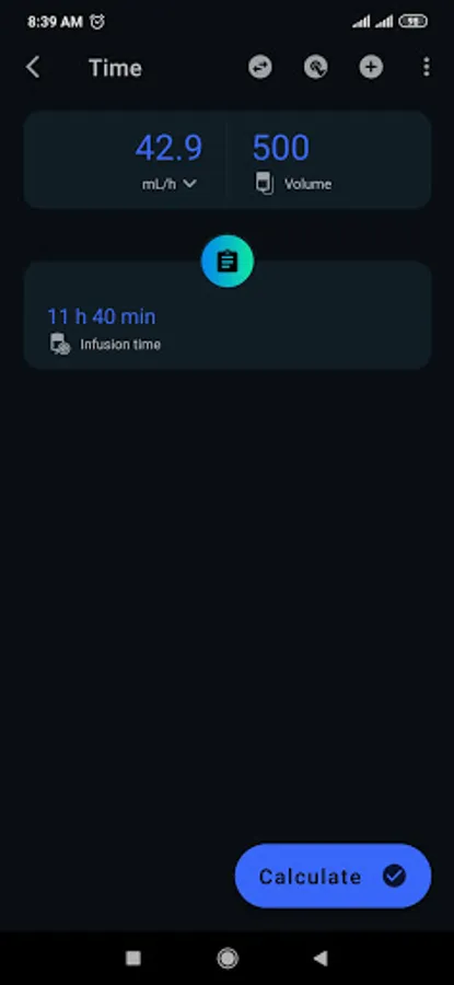 • Infusion volume — Enter infusion rate (mL/h or gtts/min) and desired infusion time to get the infusion volume.