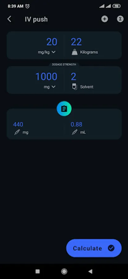 • IV bolus/IV push — Enter desired dose, weight, drug amount and solvent volume to get the drug amount and volume to administer.