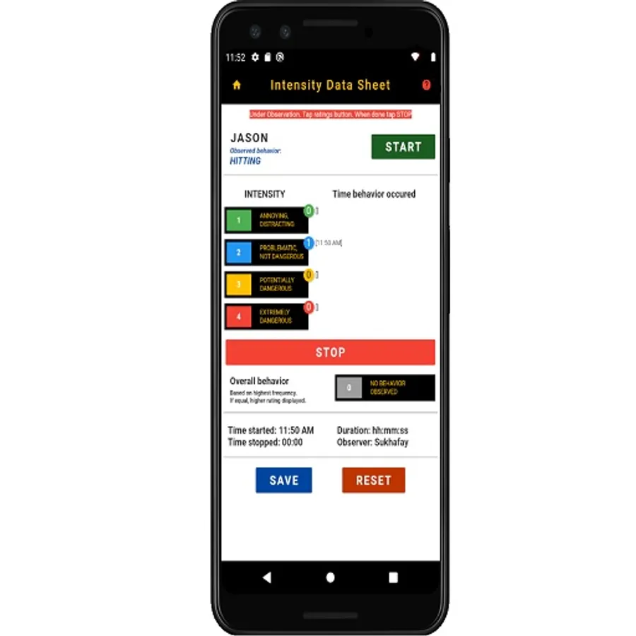 The main intention of this app is to free the observer from using a clipboard, a pencil and a stopwatch. This app records observation through intensity rating scale from 1 to 4, including the frequency, time behavior occurred, overall behavior and duration of observation. Finally the observation is saved as a report in csv format for further analysis.