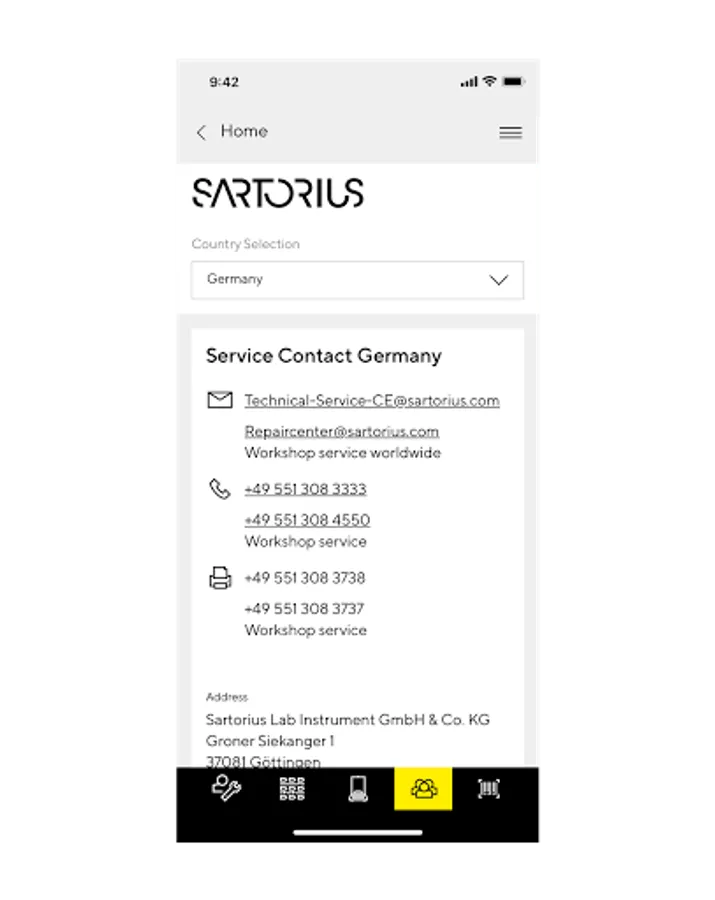 You can find all the necessary contact details for your Sartorius service directly in the app. During working hours, no matter if your question is technical or another issue, the telephone number is there ready to dial. Sartorius is always happy to help you.