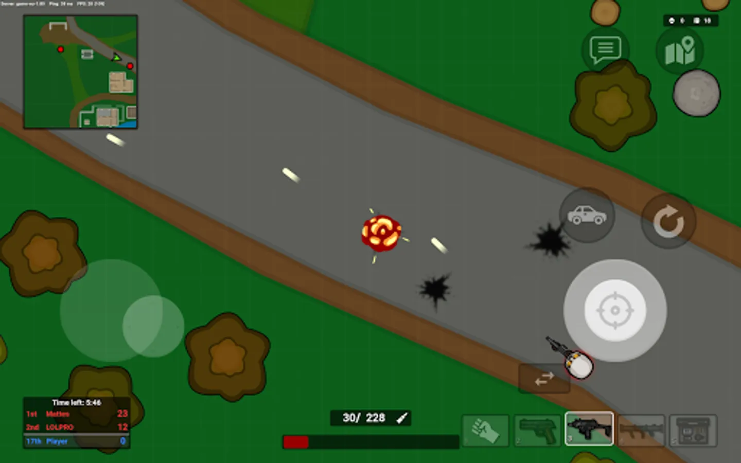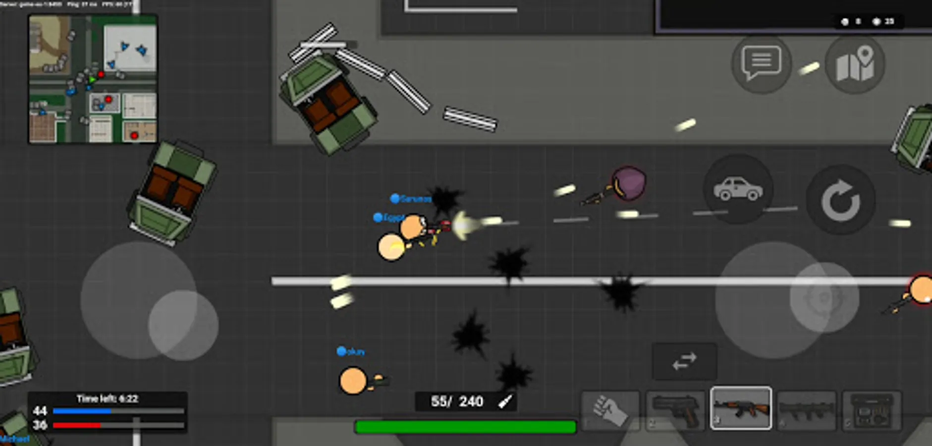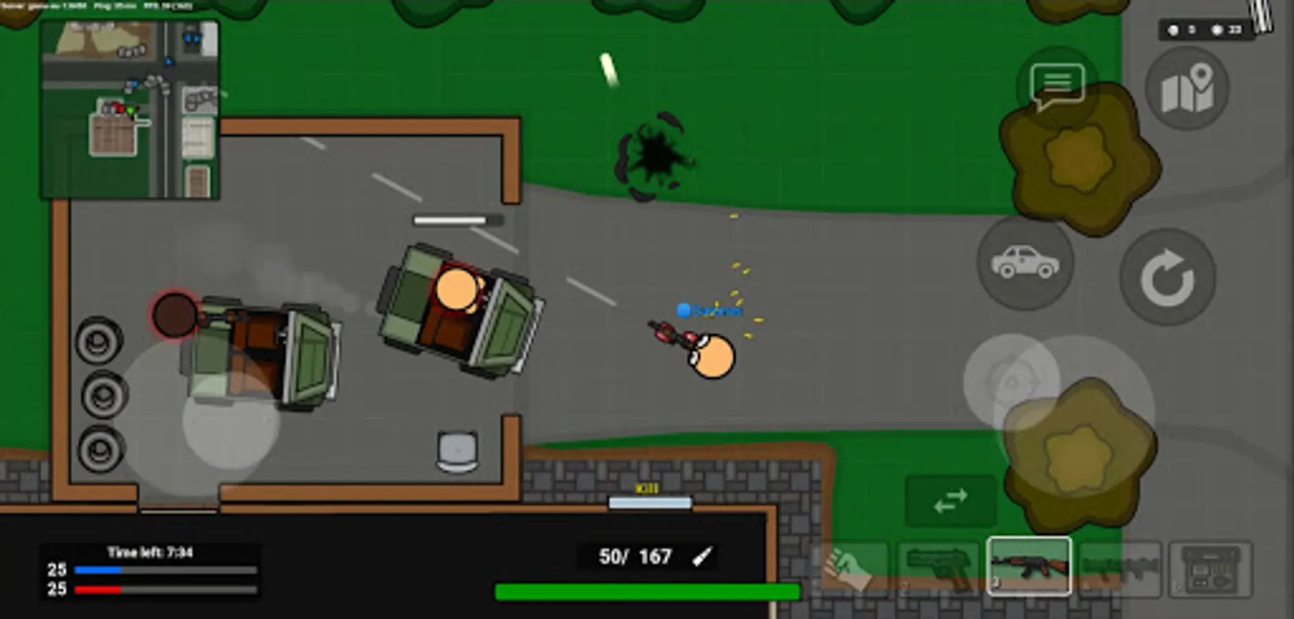 Battle Dudes .io is a real multiplayer 2d shooter game with a fully destructible map, where you fight other teams and players for the victory! The game has multiple distinct maps and multiple gamemodes like capture the flag, team deathmatch, gun game and more for you to choose from, with many map and gamemode combinations. To aid you in fighting the enemies at your arsenal you have over 20 different weapons that you can unlock by playing the game and gaining XP points.