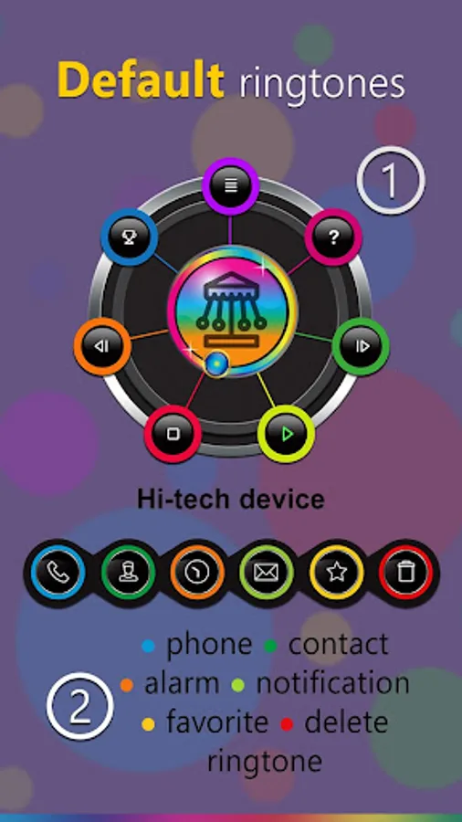• Make a default ringtone, contact ringtone, default notification, default alarm, delete ringtone, select and mark your favorites