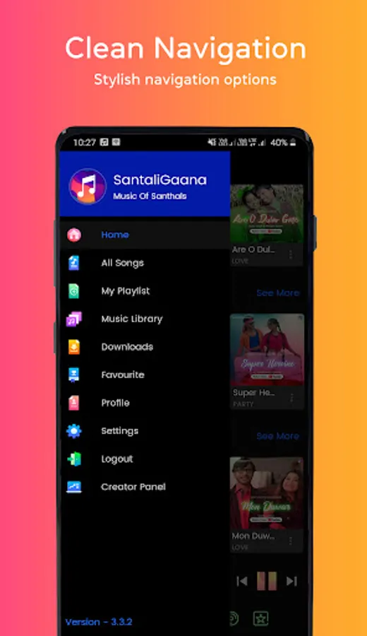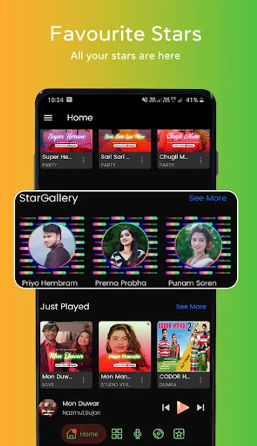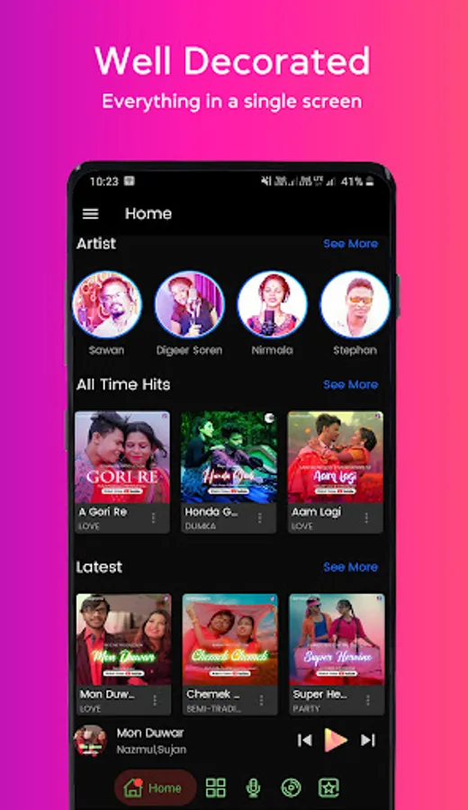 Enjoy thousands of top santali songs from a wide rage of new song to old songs. Listen your favorite song from your favorite artist all arranged separately for easy and smooth navigation. There are too many playlist for all top charts and most listened songs.