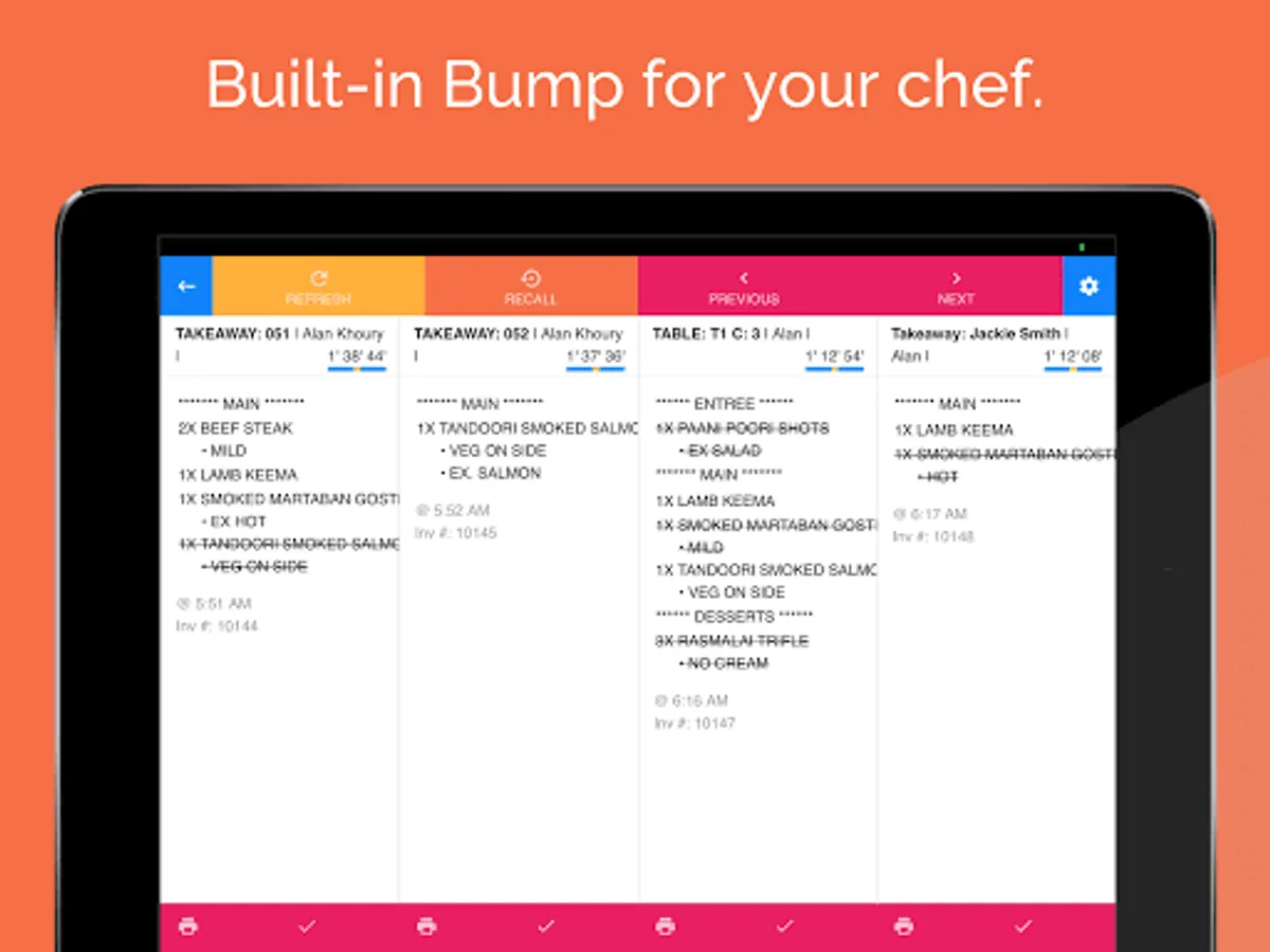 Restaurant POS is also a Bump App where you can install it inside your kitchen and track floor orders wirelessly. This gives you the ability to bump off or even cross off (new feature) items and orders as they are prepared. Once an order is complete, you can track the duration the meal took to prepare via our Analytics app.