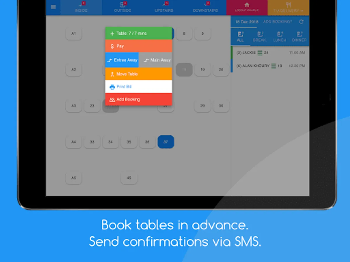 Give your customers the ability to book their tables up to 12 months in advance using our booking module, which is built-in to our Restaurant POS. Other features include the ability to send reservation information via SMS, reminders and more importantly an online integration with your website booking module.