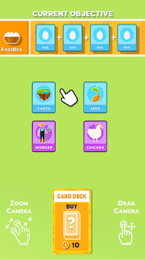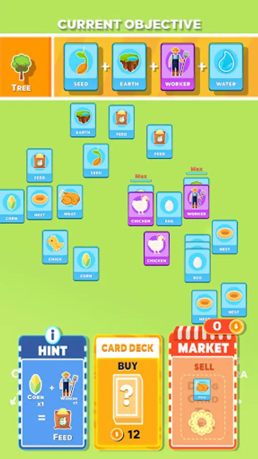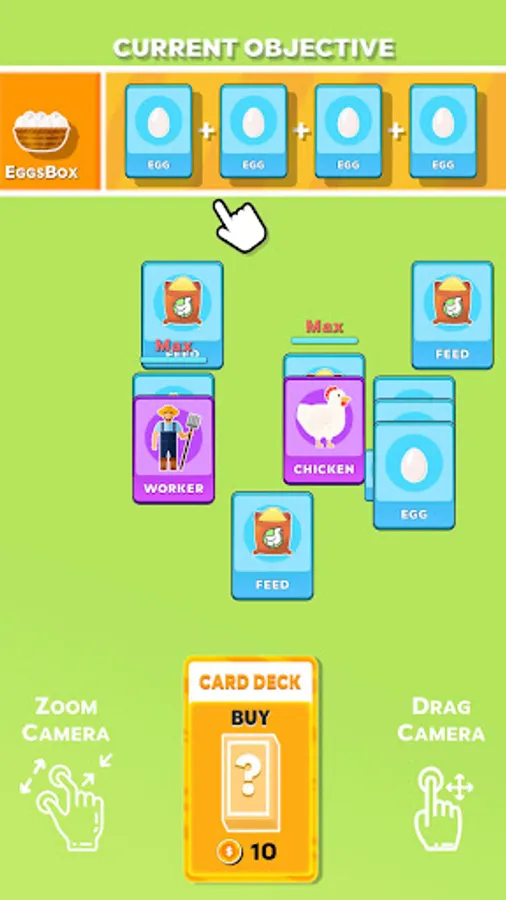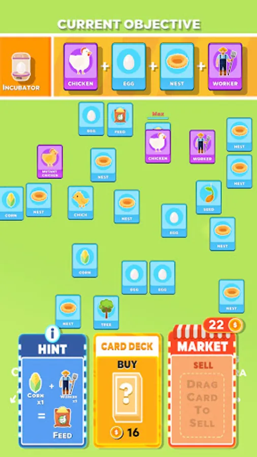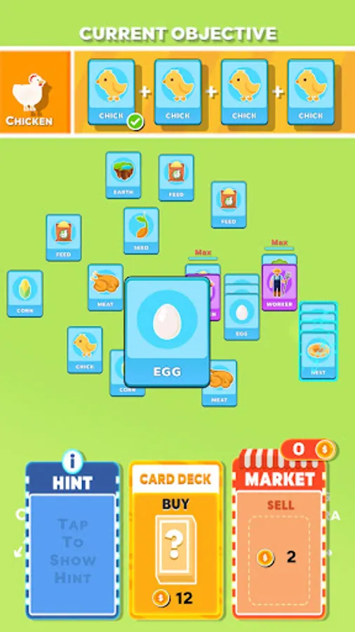 You can try different combinations of cards to produce higher value chickens and sell them for money. The more money you earn, the more cards you can unlock, and the bigger your farm can be grown. You can use the money earned to expand your farm, purchase upgrades and new equipment, and unlock new stacks of cards to discover new chicken breeds and earn more money.