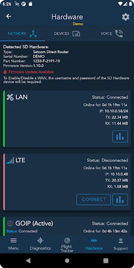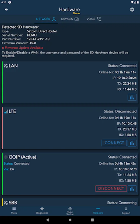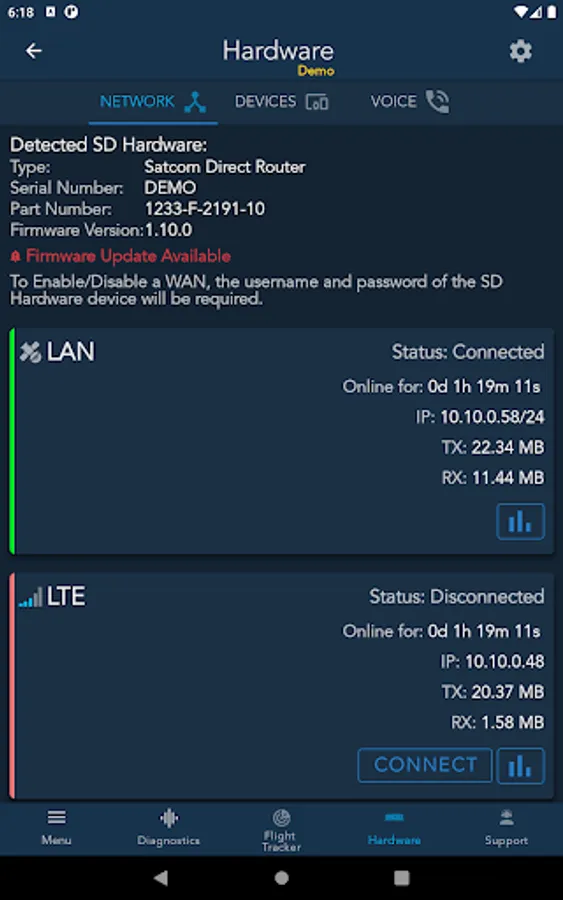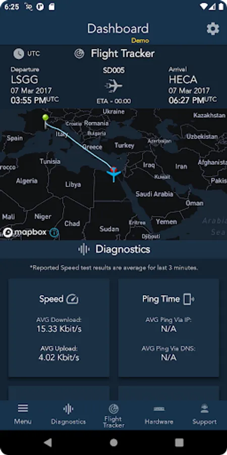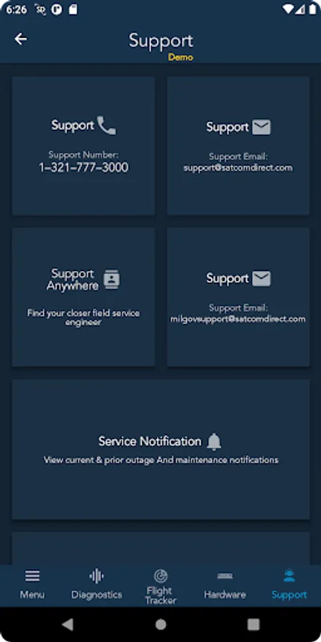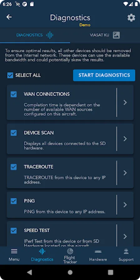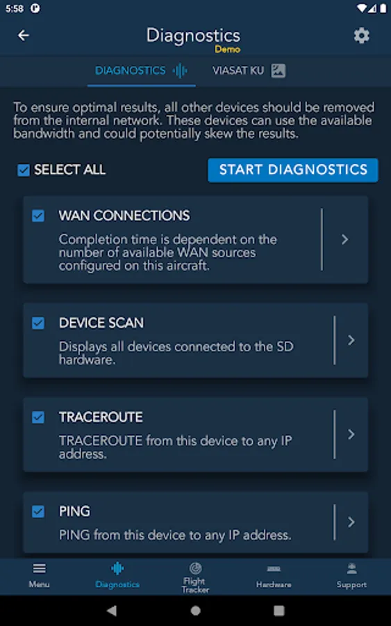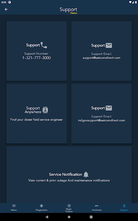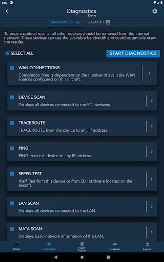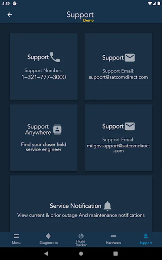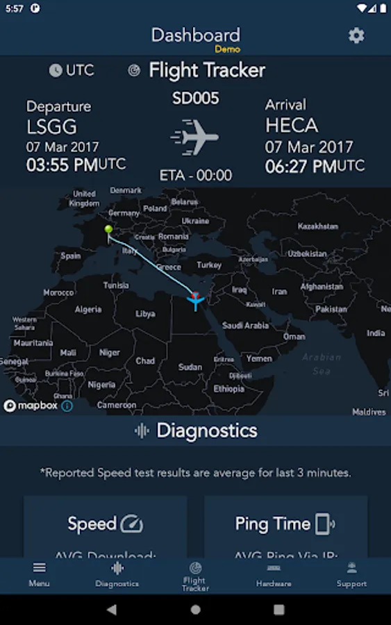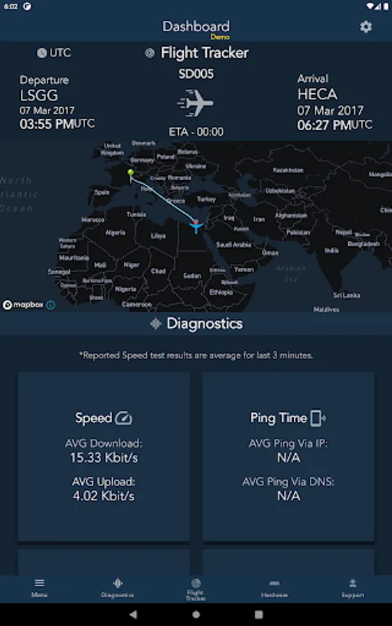 The SD Cabin app simplifies the in flight connectivity experience through seamless access to multiple key functions from a single application while on board an aircraft equipped with SD Hardware. SD Cabin dynamically detects the services activated on your aircraft and enables access to functions based on these services. SD Cabin provides trip information, device and network connectivity management, basic and advanced troubleshooting tools, plus valuable access to our award winning Satcom Direct Support team.
